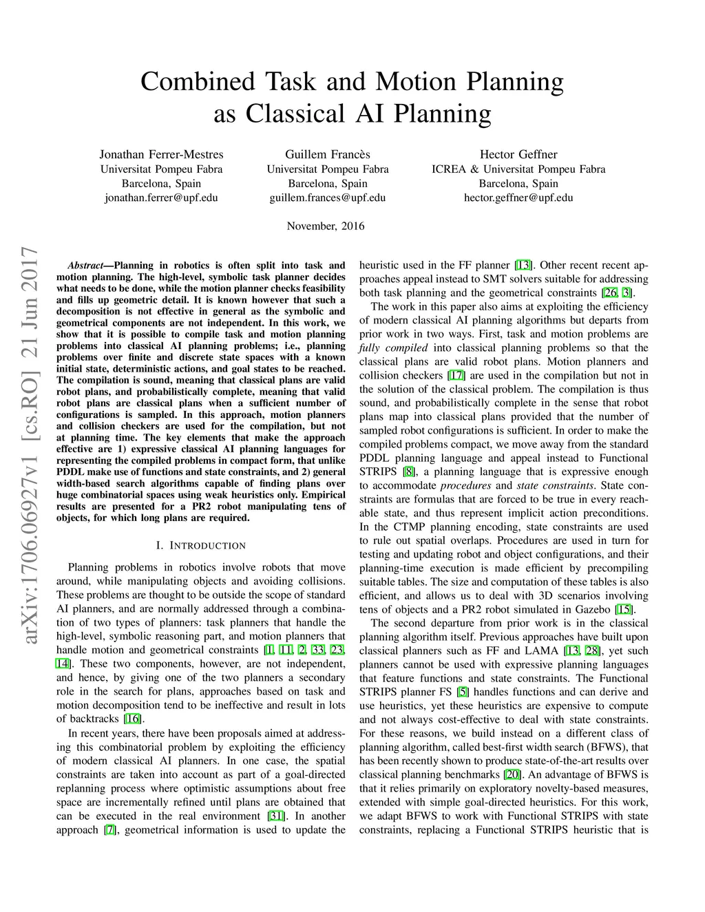 Planning in robotics is often split into task and motion planning. The high-level, symbolic task planner decides what needs to be done, while the motion planner checks feasibility and fills up geometric detail. It is known however that such a decomposition is not effective in general as the symbolic and geometrical components are not independent. In this work, we show that it is possible to compile task and motion planning problems into classical AI planning problems; i.e., planning problems over finite and discrete state spaces with a known initial state, deterministic actions, and goal states to be reached. The compilation is sound, meaning that classical plans are valid robot plans, and probabilistically complete, meaning that valid robot plans are classical plans when a sufficient number of configurations is sampled. In this approach, motion planners and collision checkers are used for the compilation, but not at planning time. The key elements that make the approach effective are 1) expressive classical AI planning languages for representing the compiled problems in compact form, that unlike PDDL make use of functions and state constraints, and 2) general width-based search algorithms capable of finding plans over huge combinatorial spaces using weak heuristics only. Empirical results are presented for a PR2 robot manipulating tens of objects, for which long plans are required.