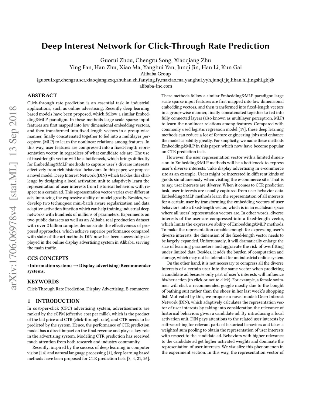 Deep Interest Network for Click-Through Rate Prediction