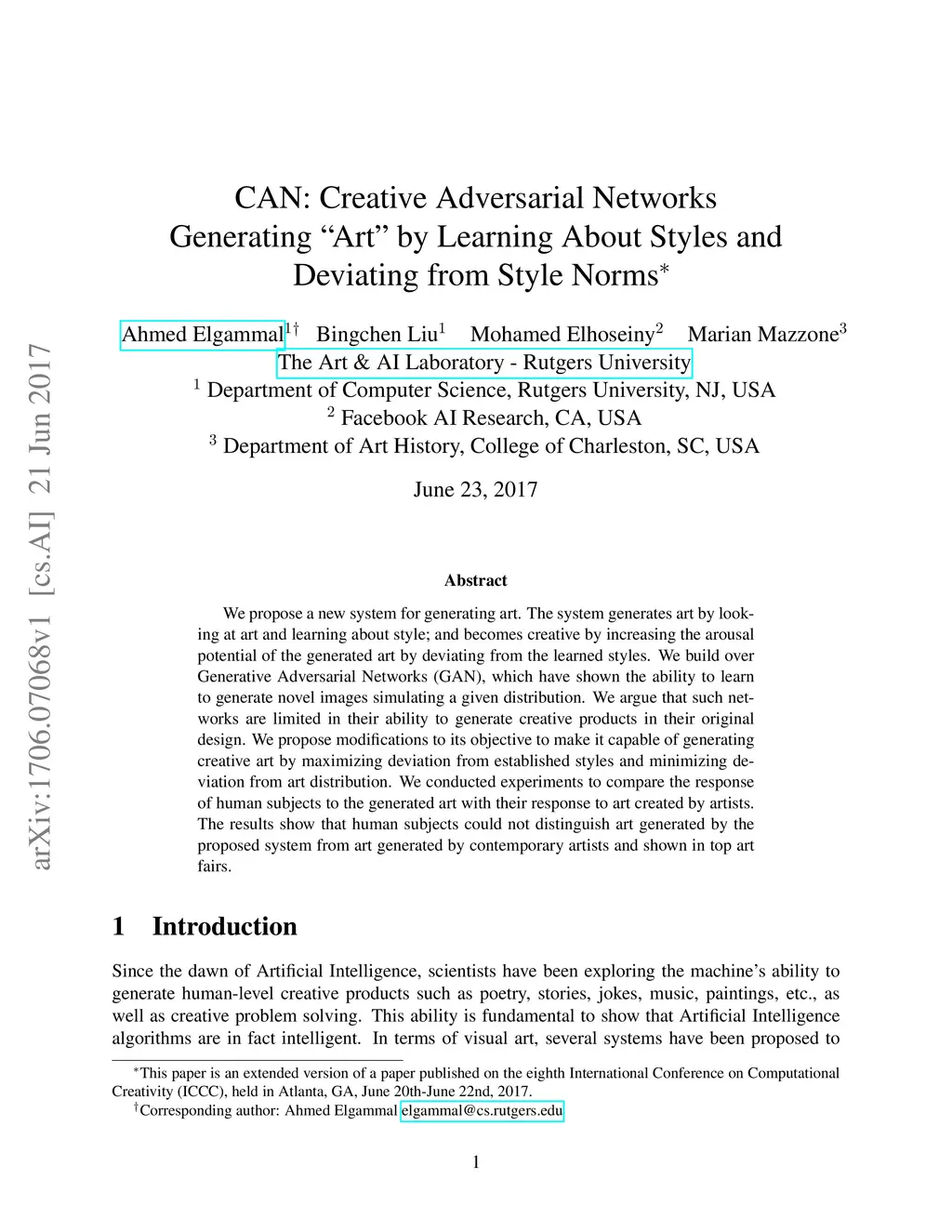 We propose a new system for generating art. The system generates art by looking at art and learning about style; and becomes creative by increasing the arousal potential of the generated art by deviating from the learned styles. We build over Generative Adversarial Networks (GAN), which have shown the ability to learn to generate novel images simulating a given distribution. We argue that such networks are limited in their ability to generate creative products in their original design. We propose modifications to its objective to make it capable of generating creative art by maximizing deviation from established styles and minimizing deviation from art distribution. We conducted experiments to compare the response of human subjects to the generated art with their response to art created by artists. The results show that human subjects could not distinguish art generated by the proposed system from art generated by contemporary artists and shown in top art fairs. Human subjects even rated the generated images higher on various scales.