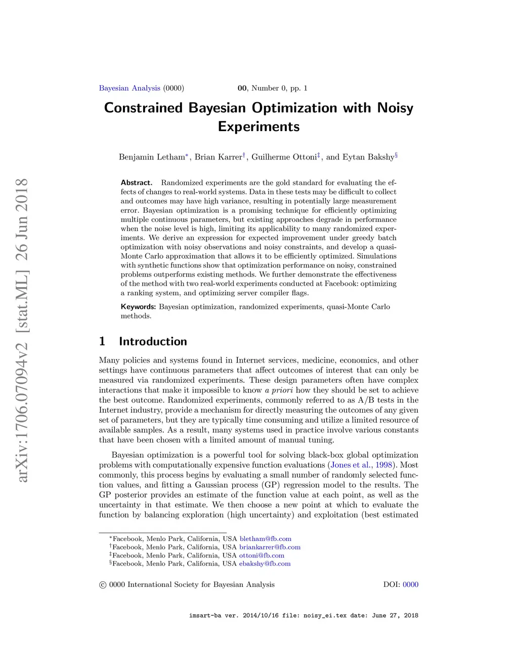 Randomized experiments are the gold standard for evaluating the effects of changes to real-world systems. Data in these tests may be difficult to collect and outcomes may have high variance, resulting in potentially large measurement error. Bayesian optimization is a promising technique for efficiently optimizing multiple continuous parameters, but existing approaches degrade in performance when the noise level is high, limiting its applicability to many randomized experiments. We derive an expression for expected improvement under greedy batch optimization with noisy observations and noisy constraints, and develop a quasi-Monte Carlo approximation that allows it to be efficiently optimized. Simulations with synthetic functions show that optimization performance on noisy, constrained problems outperforms existing methods. We further demonstrate the effectiveness of the method with two real-world experiments conducted at Facebook: optimizing a ranking system, and optimizing server compiler flags.