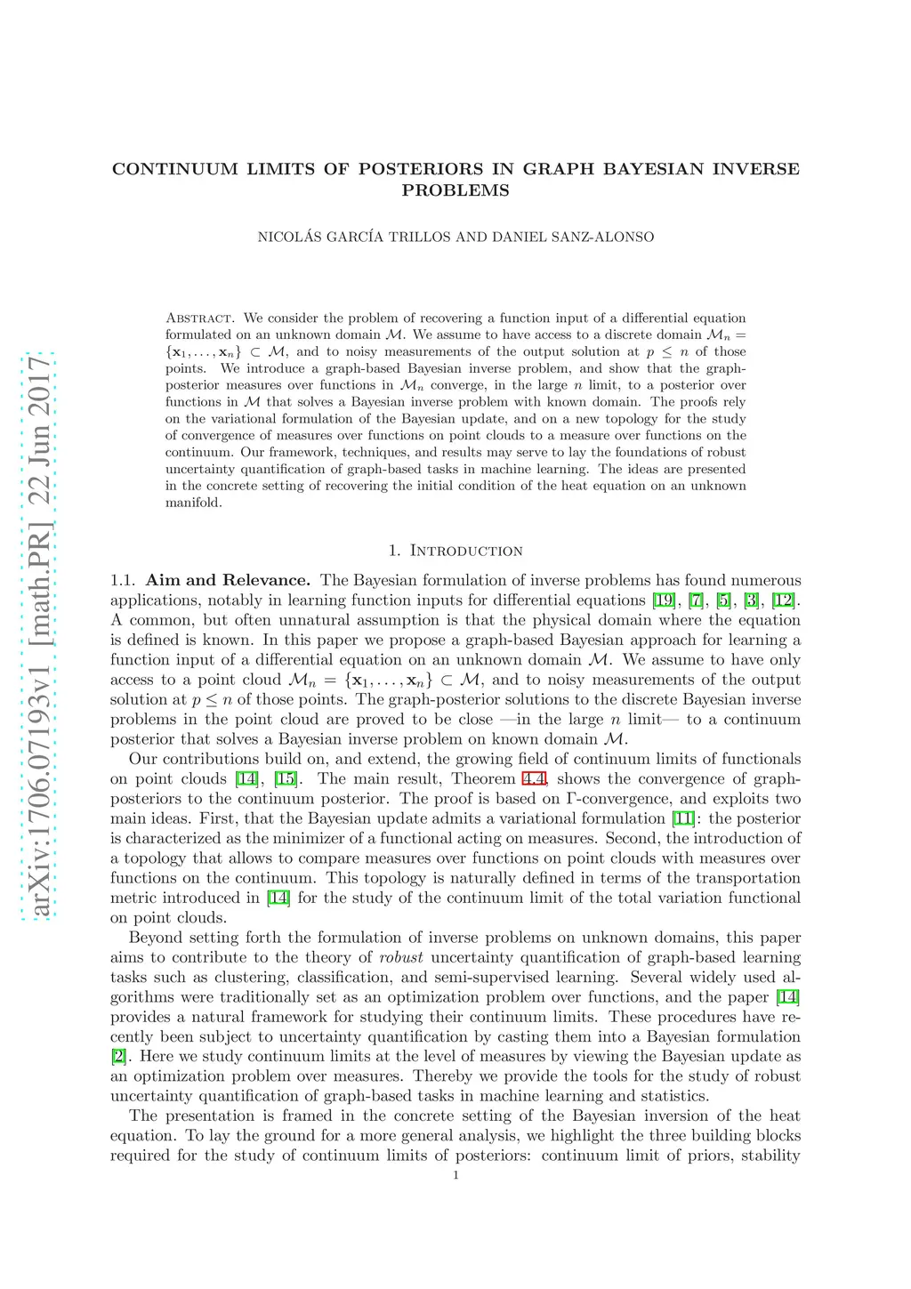 We consider the problem of recovering a function input of a differential equation formulated on an unknown domain . We assume to have access to a discrete domain , and to noisy measurements of the output solution at of those points. We introduce a graph-based Bayesian inverse problem, and show that the graph-posterior measures over functions in converge, in the large limit, to a posterior over functions in that solves a Bayesian inverse problem with known domain. The proofs rely on the variational formulation of the Bayesian update, and on a new topology for the study of convergence of measures over functions on point clouds to a measure over functions on the continuum. Our framework, techniques, and results may serve to lay the foundations of robust uncertainty quantification of graph-based tasks in machine learning. The ideas are presented in the concrete setting of recovering the initial condition of the heat equation on an unknown manifold.