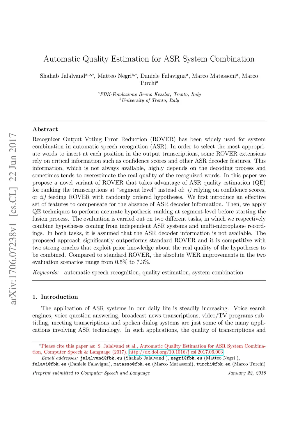 Recognizer Output Voting Error Reduction (ROVER) has been widely used for system combination in automatic speech recognition (ASR). In order to select the most appropriate words to insert at each position in the output transcriptions, some ROVER extensions rely on critical information such as confidence scores and other ASR decoder features. This information, which is not always available, highly depends on the decoding process and sometimes tends to over estimate the real quality of the recognized words. In this paper we propose a novel variant of ROVER that takes advantage of ASR quality estimation (QE) for ranking the transcriptions at "segment level" instead of: i) relying on confidence scores, or ii) feeding ROVER with randomly ordered hypotheses. We first introduce an effective set of features to compensate for the absence of ASR decoder information. Then, we apply QE techniques to perform accurate hypothesis ranking at segment-level before starting the fusion process. The evaluation is carried out on two different tasks, in which we respectively combine hypotheses coming from independent ASR systems and multi-microphone recordings. In both tasks, it is assumed that the ASR decoder information is not available. The proposed approach significantly outperforms standard ROVER and it is competitive with two strong oracles that e xploit prior knowledge about the real quality of the hypotheses to be combined. Compared to standard ROVER, the abs olute WER improvements in the two evaluation scenarios range from 0.5% to 7.3%.