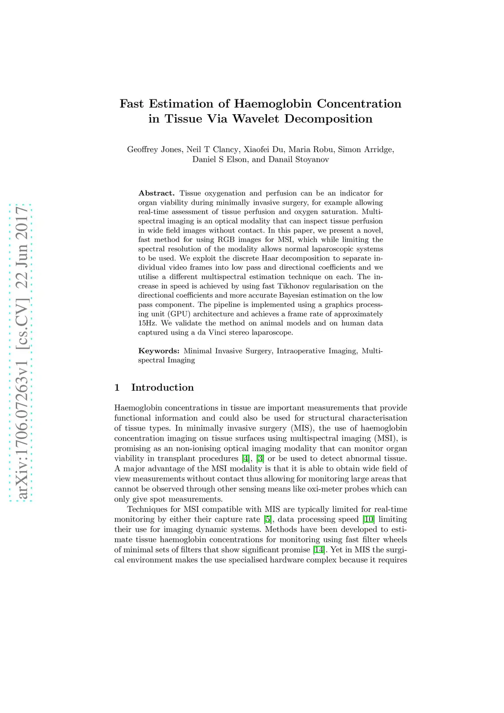 Tissue oxygenation and perfusion can be an indicator for organ viability during minimally invasive surgery, for example allowing real-time assessment of tissue perfusion and oxygen saturation. Multispectral imaging is an optical modality that can inspect tissue perfusion in wide field images without contact. In this paper, we present a novel, fast method for using RGB images for MSI, which while limiting the spectral resolution of the modality allows normal laparoscopic systems to be used. We exploit the discrete Haar decomposition to separate individual video frames into low pass and directional coefficients and we utilise a different multispectral estimation technique on each. The increase in speed is achieved by using fast Tikhonov regularisation on the directional coefficients and more accurate Bayesian estimation on the low pass component. The pipeline is implemented using a graphics processing unit (GPU) architecture and achieves a frame rate of approximately 15Hz. We validate the method on animal models and on human data captured using a da Vinci stereo laparoscope.