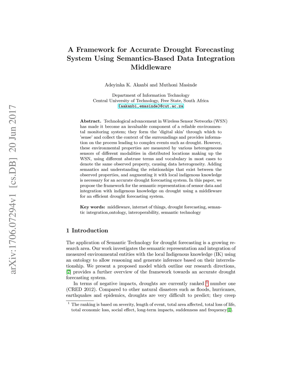 Technological advancement in Wireless Sensor Networks (WSN) has made it become an invaluable component of a reliable environmental monitoring system; they form the digital skin' through which to 'sense' and collect the context of the surroundings and provides information on the process leading to complex events such as drought. However, these environmental properties are measured by various heterogeneous sensors of different modalities in distributed locations making up the WSN, using different abstruse terms and vocabulary in most cases to denote the same observed property, causing data heterogeneity. Adding semantics and understanding the relationships that exist between the observed properties, and augmenting it with local indigenous knowledge is necessary for an accurate drought forecasting system. In this paper, we propose the framework for the semantic representation of sensor data and integration with indigenous knowledge on drought using a middleware for an efficient drought forecasting system.