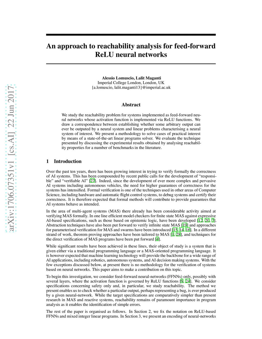 We study the reachability problem for systems implemented as feed-forward neural networks whose activation function is implemented via ReLU functions. We draw a correspondence between establishing whether some arbitrary output can ever be outputed by a neural system and linear problems characterising a neural system of interest. We present a methodology to solve cases of practical interest by means of a state-of-the-art linear programs solver. We evaluate the technique presented by discussing the experimental results obtained by analysing reachability properties for a number of benchmarks in the literature.