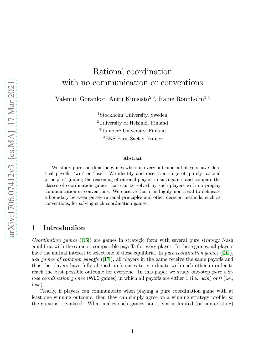 We study pure coordination games where in every outcome, all players have identical payoffs, 'win' or 'lose'. We identify and discuss a range of 'purely rational principles' guiding the reasoning of rational players in such games and analyze which classes of coordination games can be solved by such players with no preplay communication or conventions. We observe that it is highly nontrivial to delineate a boundary between purely rational principles and other decision methods, such as conventions, for solving such coordination games.