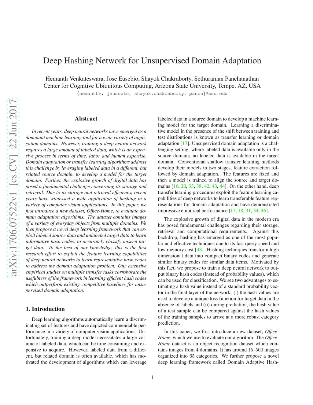 In recent years, deep neural networks have emerged as a dominant machine learning tool for a wide variety of application domains. However, training a deep neural network requires a large amount of labeled data, which is an expensive process in terms of time, labor and human expertise. Domain adaptation or transfer learning algorithms address this challenge by leveraging labeled data in a different, but related source domain, to develop a model for the target domain. Further, the explosive growth of digital data has posed a fundamental challenge concerning its storage and retrieval. Due to its storage and retrieval efficiency, recent years have witnessed a wide application of hashing in a variety of computer vision applications. In this paper, we first introduce a new dataset, Office-Home, to evaluate domain adaptation algorithms. The dataset contains images of a variety of everyday objects from multiple domains. We then propose a novel deep learning framework that can exploit labeled source data and unlabeled target data to learn informative hash codes, to accurately classify unseen target data. To the best of our knowledge, this is the first research effort to exploit the feature learning capabilities of deep neural networks to learn representative hash codes to address the domain adaptation problem. Our extensive empirical studies on multiple transfer tasks corroborate the usefulness of the framework in learning efficient hash codes which outperform existing competitive baselines for unsupervised domain adaptation.