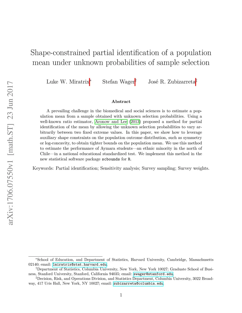 A prevailing challenge in the biomedical and social sciences is to estimate a population mean from a sample obtained with unknown selection probabilities. Using a well-known ratio estimator, Aronow and Lee (2013) proposed a method for partial identification of the mean by allowing the unknown selection probabilities to vary arbitrarily between two fixed extreme values. In this paper, we show how to leverage auxiliary shape constraints on the population outcome distribution, such as symmetry or log-concavity, to obtain tighter bounds on the population mean. We use this method to estimate the performance of Aymara students---an ethnic minority in the north of Chile---in a national educational standardized test. We implement this method in the new statistical software package scbounds for R.
