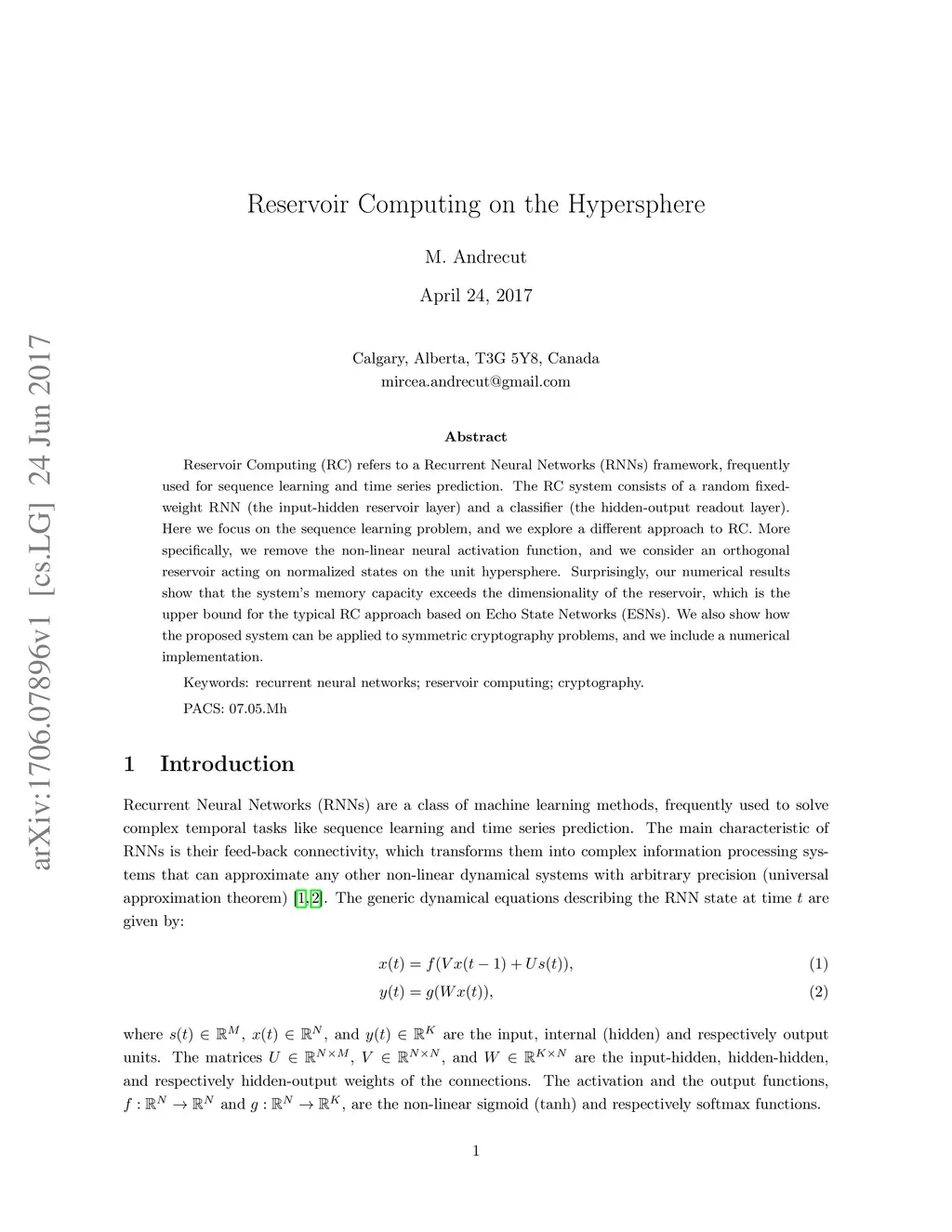 Reservoir Computing (RC) refers to a Recurrent Neural Networks (RNNs) framework, frequently used for sequence learning and time series prediction. The RC system consists of a random fixed-weight RNN (the input-hidden reservoir layer) and a classifier (the hidden-output readout layer). Here we focus on the sequence learning problem, and we explore a different approach to RC. More specifically, we remove the non-linear neural activation function, and we consider an orthogonal reservoir acting on normalized states on the unit hypersphere. Surprisingly, our numerical results show that the system's memory capacity exceeds the dimensionality of the reservoir, which is the upper bound for the typical RC approach based on Echo State Networks (ESNs). We also show how the proposed system can be applied to symmetric cryptography problems, and we include a numerical implementation.
