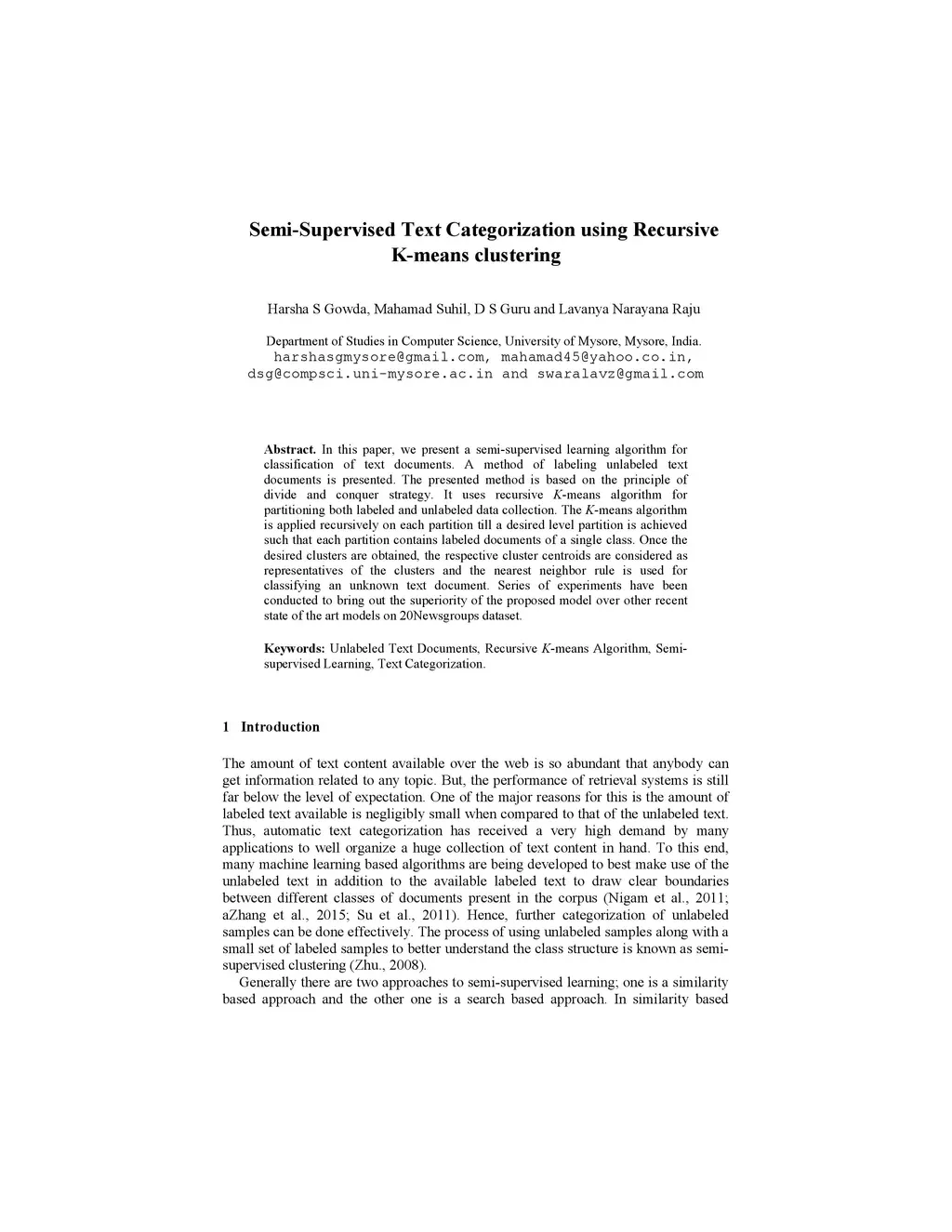 Semi-supervised Text Categorization Using Recursive K-means Clustering