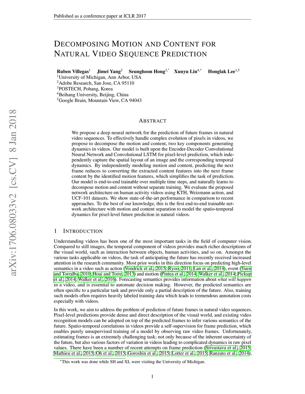 Decomposing Motion and Content for Natural Video Sequence Prediction
