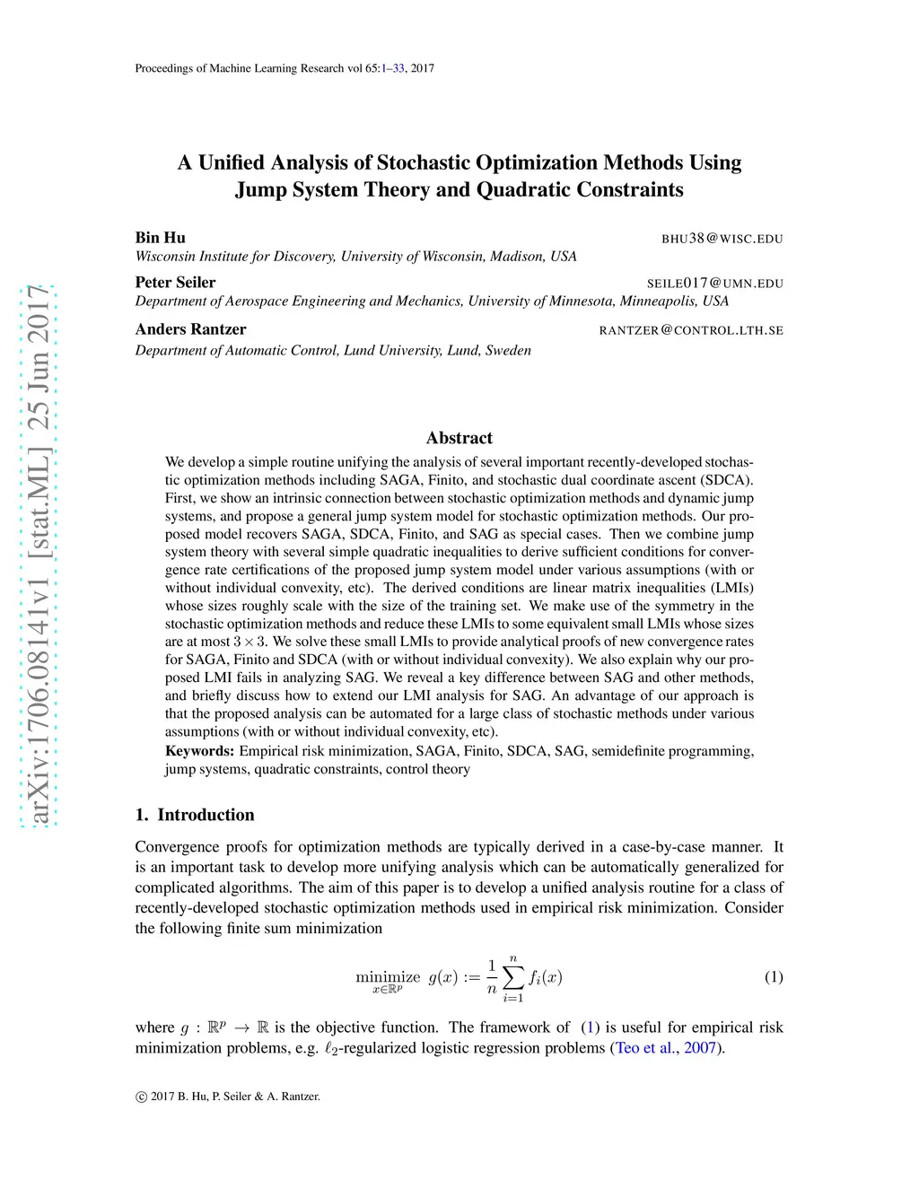 We develop a simple routine unifying the analysis of several important recently-developed stochastic optimization methods including SAGA, Finito, and stochastic dual coordinate ascent (SDCA). First, we show an intrinsic connection between stochastic optimization methods and dynamic jump systems, and propose a general jump system model for stochastic optimization methods. Our proposed model recovers SAGA, SDCA, Finito, and SAG as special cases. Then we combine jump system theory with several simple quadratic inequalities to derive sufficient conditions for convergence rate certifications of the proposed jump system model under various assumptions (with or without individual convexity, etc). The derived conditions are linear matrix inequalities (LMIs) whose sizes roughly scale with the size of the training set. We make use of the symmetry in the stochastic optimization methods and reduce these LMIs to some equivalent small LMIs whose sizes are at most 3 by 3. We solve these small LMIs to provide analytical proofs of new convergence rates for SAGA, Finito and SDCA (with or without individual convexity). We also explain why our proposed LMI fails in analyzing SAG. We reveal a key difference between SAG and other methods, and briefly discuss how to extend our LMI analysis for SAG. An advantage of our approach is that the proposed analysis can be automated for a large class of stochastic methods under various assumptions (with or without individual convexity, etc).