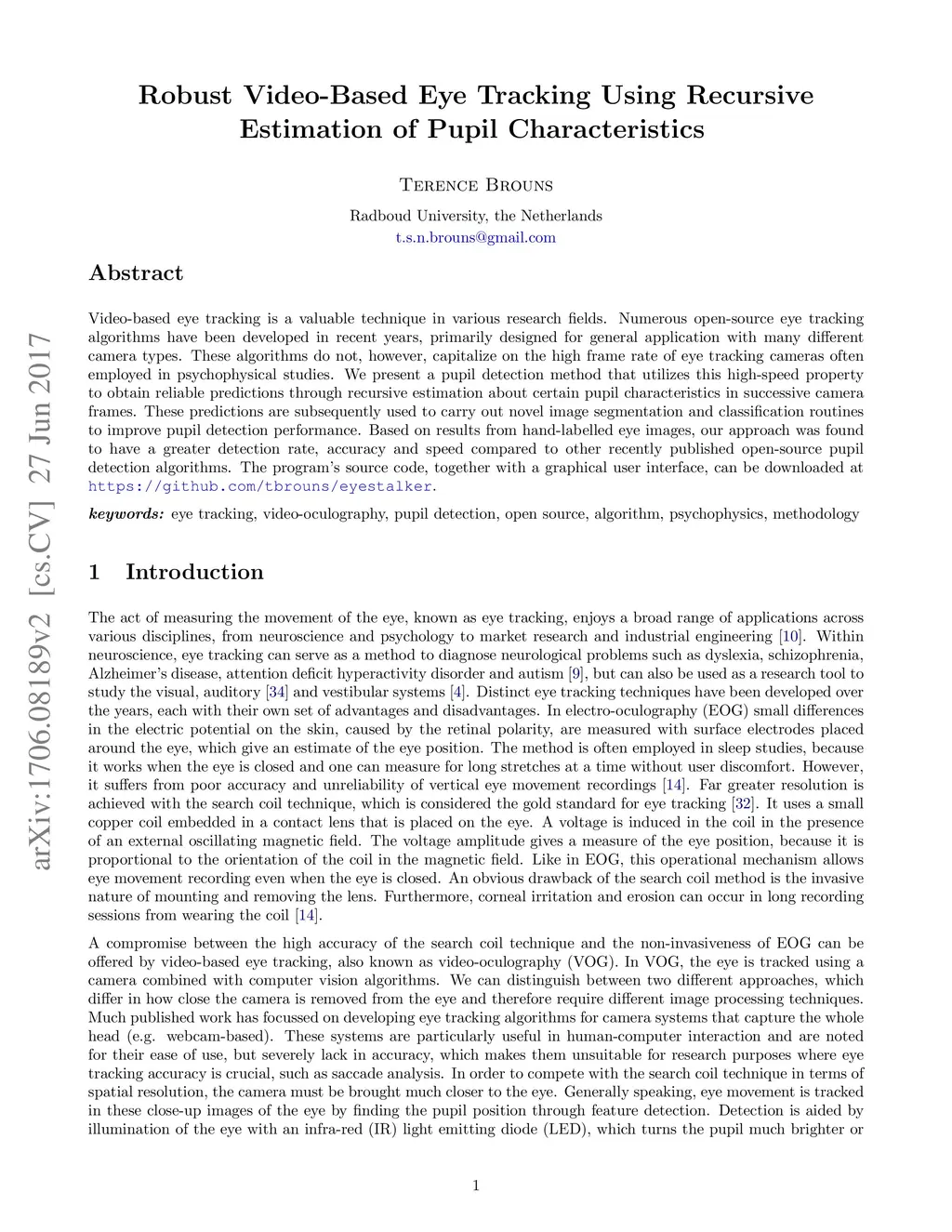 Robust Video-Based Eye Tracking Using Recursive Estimation of Pupil