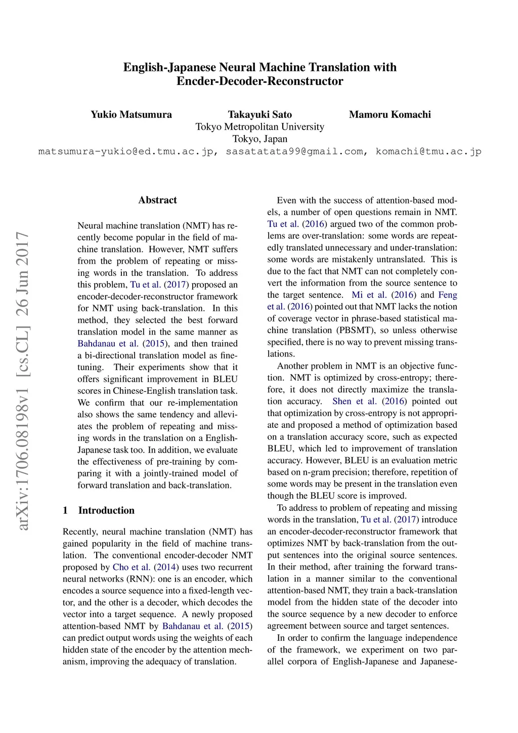 Neural machine translation (NMT) has recently become popular in the field of machine translation. However, NMT suffers from the problem of repeating or missing words in the translation. To address this problem, Tu et al. (2017) proposed an encoder-decoder-reconstructor framework for NMT using back-translation. In this method, they selected the best forward translation model in the same manner as Bahdanau et al. (2015), and then trained a bi-directional translation model as fine-tuning. Their experiments show that it offers significant improvement in BLEU scores in Chinese-English translation task. We confirm that our re-implementation also shows the same tendency and alleviates the problem of repeating and missing words in the translation on a English-Japanese task too. In addition, we evaluate the effectiveness of pre-training by comparing it with a jointly-trained model of forward translation and back-translation.