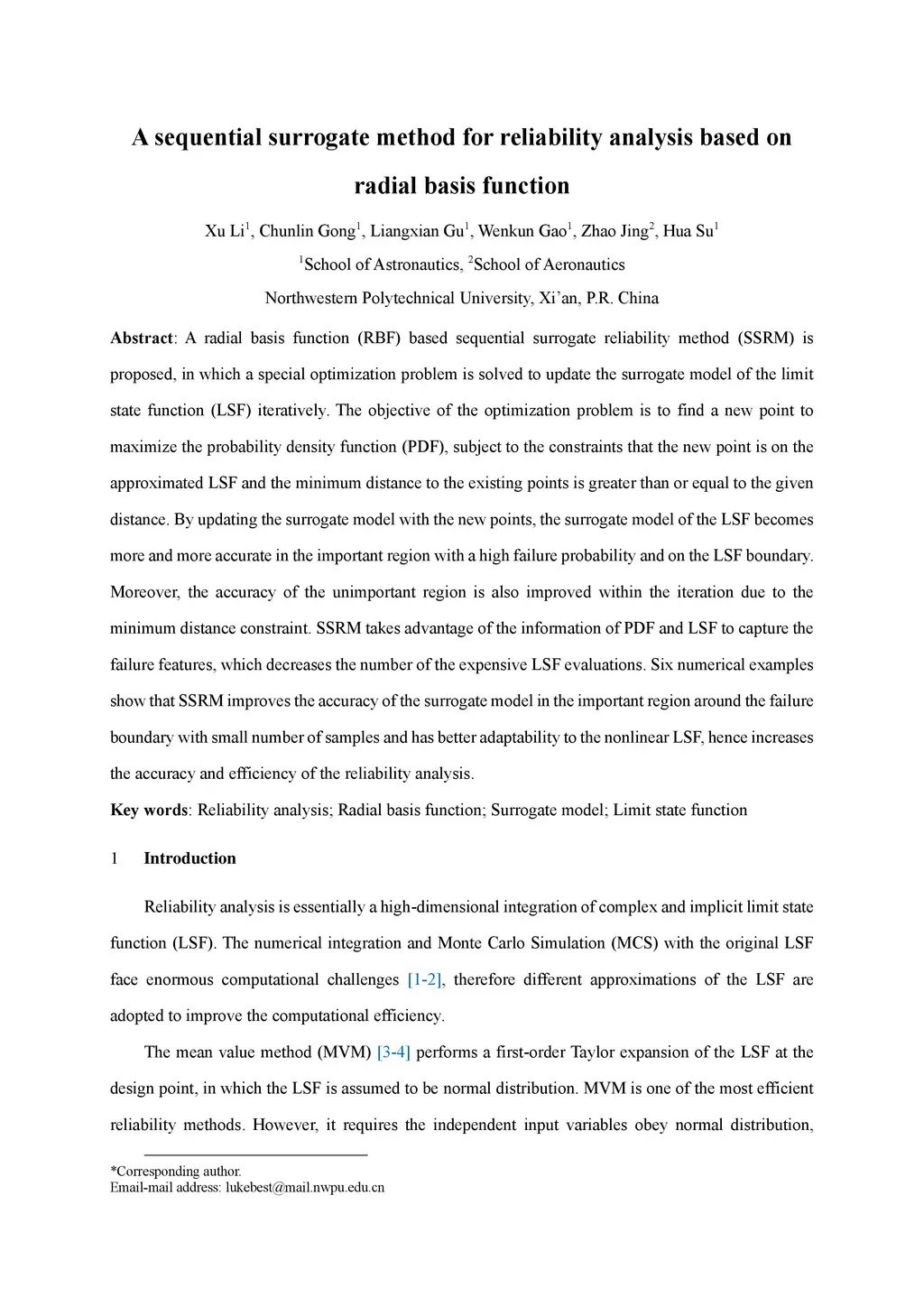 A radial basis function (RBF) based sequential surrogate reliability method (SSRM) is proposed, in which a special optimization problem is solved to update the surrogate model of the limit state function (LSF) iteratively. The objective of the optimization problem is to find a new point to maximize the probability density function (PDF), subject to the constraints that the new point is on the approximated LSF and the minimum distance to the existing points is greater than or equal to the given distance. By updating the surrogate model with the new points, the surrogate model of the LSF becomes more and more accurate in the important region with a high failure probability and on the LSF boundary. Moreover, the accuracy of the unimportant region is also improved within the iteration due to the minimum distance constraint. SSRM takes advantage of the information of PDF and LSF to capture the failure features, which decreases the number of the expensive LSF evaluations. Six numerical examples show that SSRM improves the accuracy of the surrogate model in the important region around the failure boundary with small number of samples and has better adaptability to the nonlinear LSF, hence increases the accuracy and efficiency of the reliability analysis.