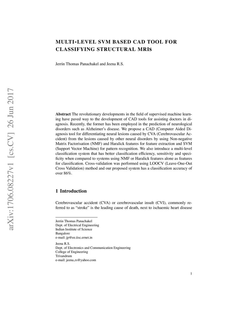 The revolutionary developments in the field of supervised machine learning have paved way to the development of CAD tools for assisting doctors in diagnosis. Recently, the former has been employed in the prediction of neurological disorders such as Alzheimer's disease. We propose a CAD (Computer Aided Diagnosis tool for differentiating neural lesions caused by CVA (Cerebrovascular Accident) from the lesions caused by other neural disorders by using Non-negative Matrix Factorisation (NMF) and Haralick features for feature extraction and SVM (Support Vector Machine) for pattern recognition. We also introduce a multi-level classification system that has better classification efficiency, sensitivity and specificity when compared to systems using NMF or Haralick features alone as features for classification. Cross-validation was performed using LOOCV (Leave-One-Out Cross Validation) method and our proposed system has a classification accuracy of over 86%.