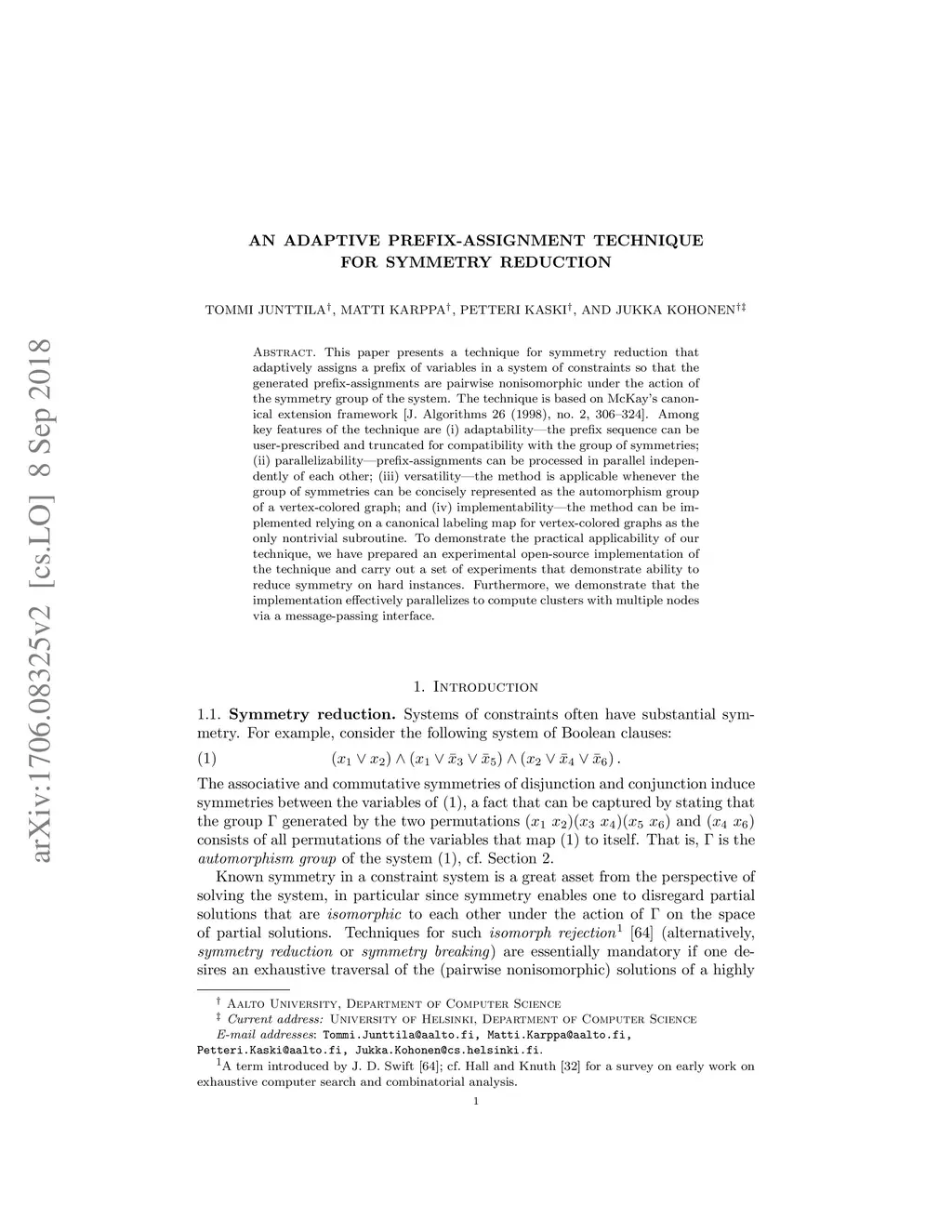 This paper presents a technique for symmetry reduction that adaptively assigns a prefix of variables in a system of constraints so that the generated prefix-assignments are pairwise nonisomorphic under the action of the symmetry group of the system. The technique is based on McKay's canonical extension framework [J. Algorithms 26 (1998), no. 2, 306-324]. Among key features of the technique are (i) adaptability - the prefix sequence can be user-prescribed and truncated for compatibility with the group of symmetries; (ii) parallelisability - prefix-assignments can be processed in parallel independently of each other; (iii) versatility - the method is applicable whenever the group of symmetries can be concisely represented as the automorphism group of a vertex-colored graph; and (iv) implementability - the method can be implemented relying on a canonical labeling map for vertex-colored graphs as the only nontrivial subroutine. To demonstrate the tentative practical applicability of our technique we have prepared a preliminary implementation and report on a limited set of experiments that demonstrate ability to reduce symmetry on hard instances.