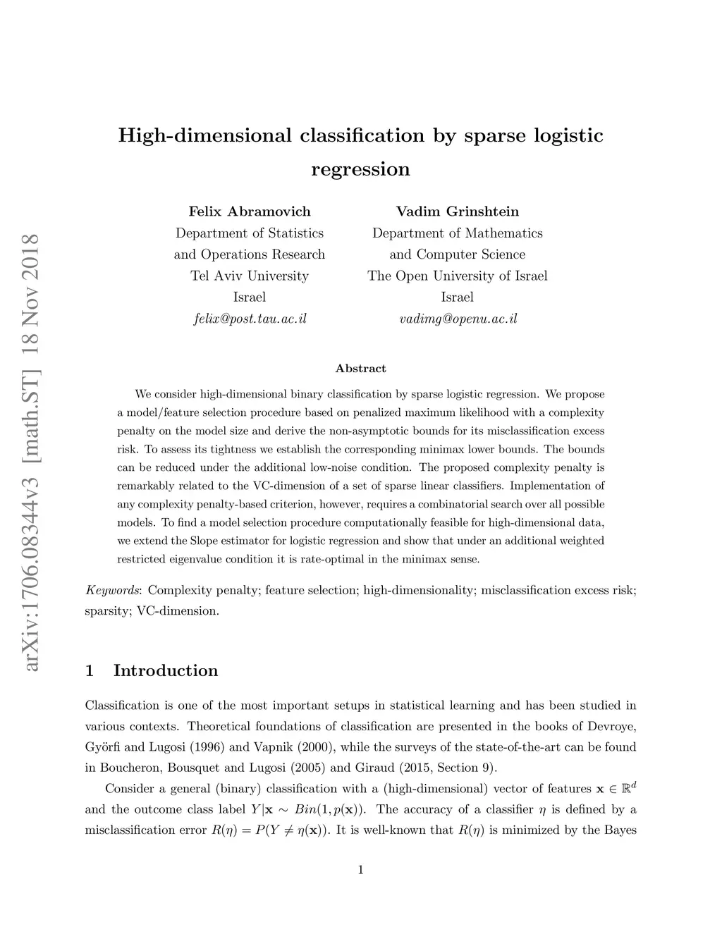 High-dimensional classification by sparse logistic regression