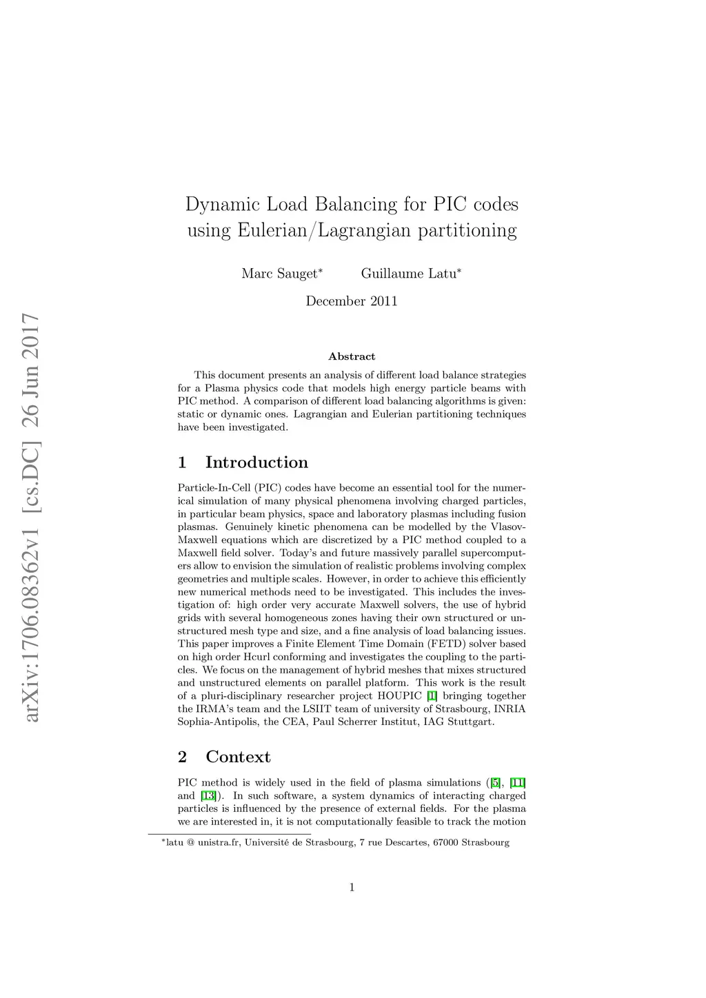 This document presents an analysis of different load balance strategies for a Plasma physics code that models high energy particle beams with PIC method. A comparison of different load balancing algorithms is given: static or dynamic ones. Lagrangian and Eulerian partitioning techniques have been investigated.
