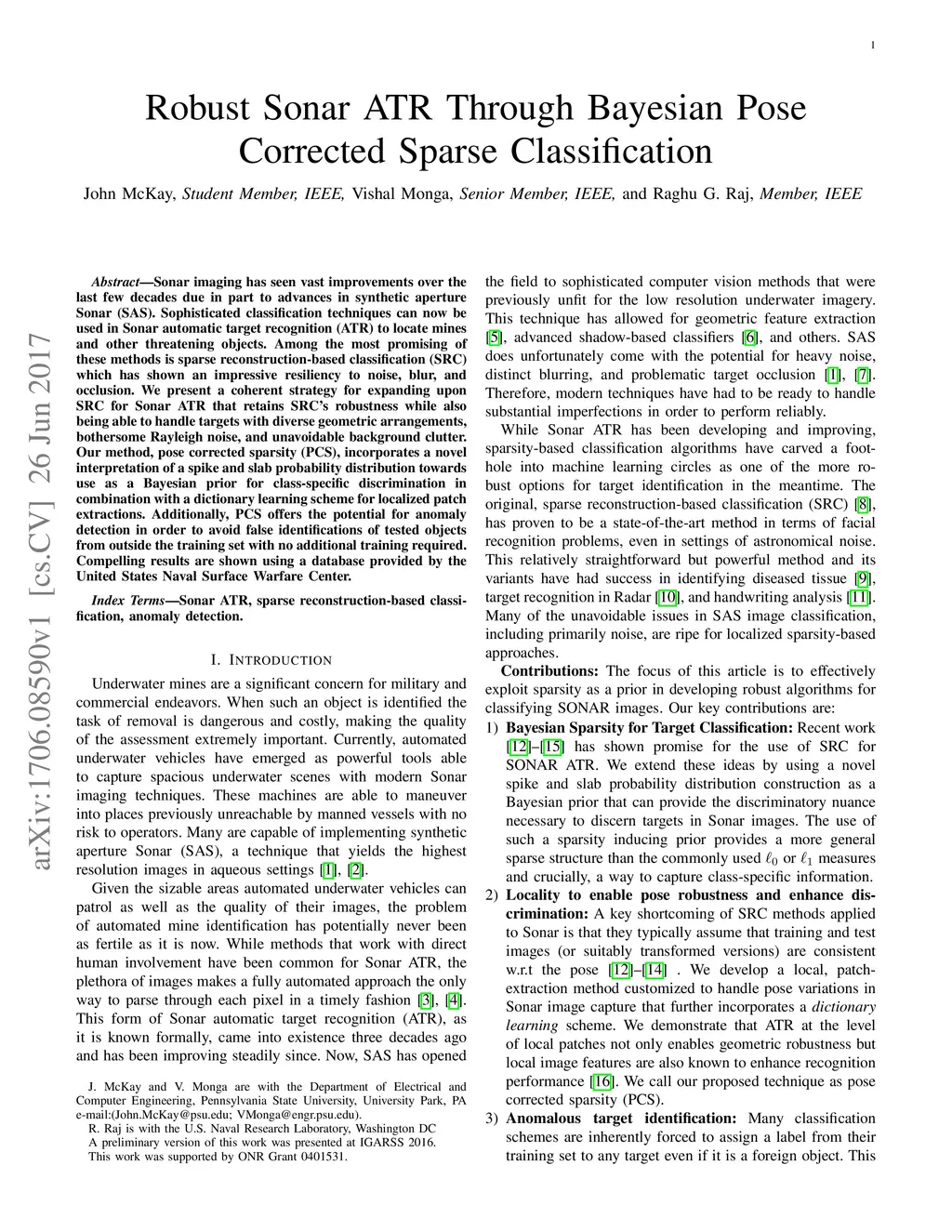 Sonar imaging has seen vast improvements over the last few decades due in part to advances in synthetic aperture Sonar (SAS). Sophisticated classification techniques can now be used in Sonar automatic target recognition (ATR) to locate mines and other threatening objects. Among the most promising of these methods is sparse reconstruction-based classification (SRC) which has shown an impressive resiliency to noise, blur, and occlusion. We present a coherent strategy for expanding upon SRC for Sonar ATR that retains SRC's robustness while also being able to handle targets with diverse geometric arrangements, bothersome Rayleigh noise, and unavoidable background clutter. Our method, pose corrected sparsity (PCS), incorporates a novel interpretation of a spike and slab probability distribution towards use as a Bayesian prior for class-specific discrimination in combination with a dictionary learning scheme for localized patch extractions. Additionally, PCS offers the potential for anomaly detection in order to avoid false identifications of tested objects from outside the training set with no additional training required. Compelling results are shown using a database provided by the United States Naval Surface Warfare Center.