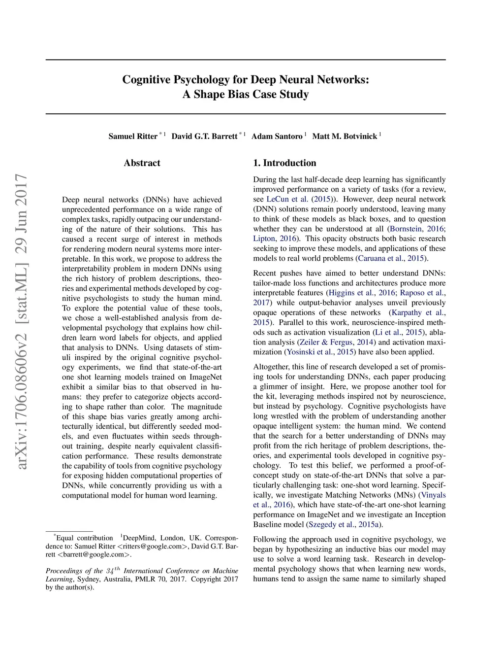 Deep neural networks (DNNs) have achieved unprecedented performance on a wide range of complex tasks, rapidly outpacing our understanding of the nature of their solutions. This has caused a recent surge of interest in methods for rendering modern neural systems more interpretable. In this work, we propose to address the interpretability problem in modern DNNs using the rich history of problem descriptions, theories and experimental methods developed by cognitive psychologists to study the human mind. To explore the potential value of these tools, we chose a well-established analysis from developmental psychology that explains how children learn word labels for objects, and applied that analysis to DNNs. Using datasets of stimuli inspired by the original cognitive psychology experiments, we find that state-of-the-art one shot learning models trained on ImageNet exhibit a similar bias to that observed in humans: they prefer to categorize objects according to shape rather than color. The magnitude of this shape bias varies greatly among architecturally identical, but differently seeded models, and even fluctuates within seeds throughout training, despite nearly equivalent classification performance. These results demonstrate the capability of tools from cognitive psychology for exposing hidden computational properties of DNNs, while concurrently providing us with a computational model for human word learning.