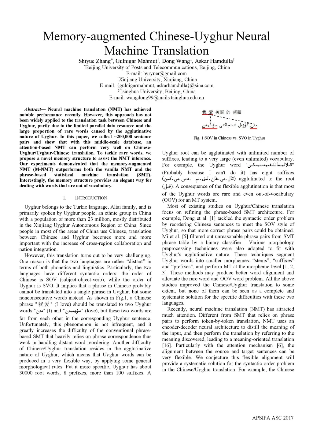 Memory-augmented Chinese-Uyghur Neural Machine Translation