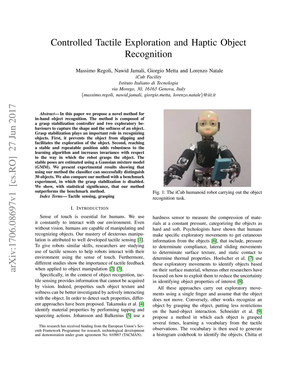 In this paper we propose a novel method for in-hand object recognition. The method is composed of a grasp stabilization controller and two exploratory behaviours to capture the shape and the softness of an object. Grasp stabilization plays an important role in recognizing objects. First, it prevents the object from slipping and facilitates the exploration of the object. Second, reaching a stable and repeatable position adds robustness to the learning algorithm and increases invariance with respect to the way in which the robot grasps the object. The stable poses are estimated using a Gaussian mixture model (GMM). We present experimental results showing that using our method the classifier can successfully distinguish 30 objects.We also compare our method with a benchmark experiment, in which the grasp stabilization is disabled. We show, with statistical significance, that our method outperforms the benchmark method.