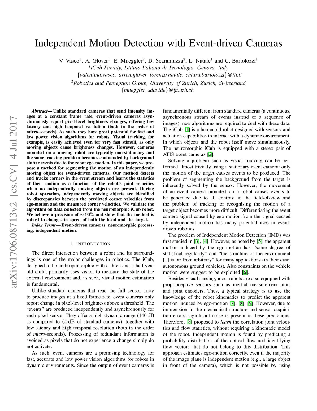 Unlike standard cameras that send intensity images at a constant frame rate, event-driven cameras asynchronously report pixel-level brightness changes, offering low latency and high temporal resolution (both in the order of micro-seconds). As such, they have great potential for fast and low power vision algorithms for robots. Visual tracking, for example, is easily achieved even for very fast stimuli, as only moving objects cause brightness changes. However, cameras mounted on a moving robot are typically non-stationary and the same tracking problem becomes confounded by background clutter events due to the robot ego-motion. In this paper, we propose a method for segmenting the motion of an independently moving object for event-driven cameras. Our method detects and tracks corners in the event stream and learns the statistics of their motion as a function of the robot's joint velocities when no independently moving objects are present. During robot operation, independently moving objects are identified by discrepancies between the predicted corner velocities from ego-motion and the measured corner velocities. We validate the algorithm on data collected from the neuromorphic iCub robot. We achieve a precision of ~ 90 % and show that the method is robust to changes in speed of both the head and the target.