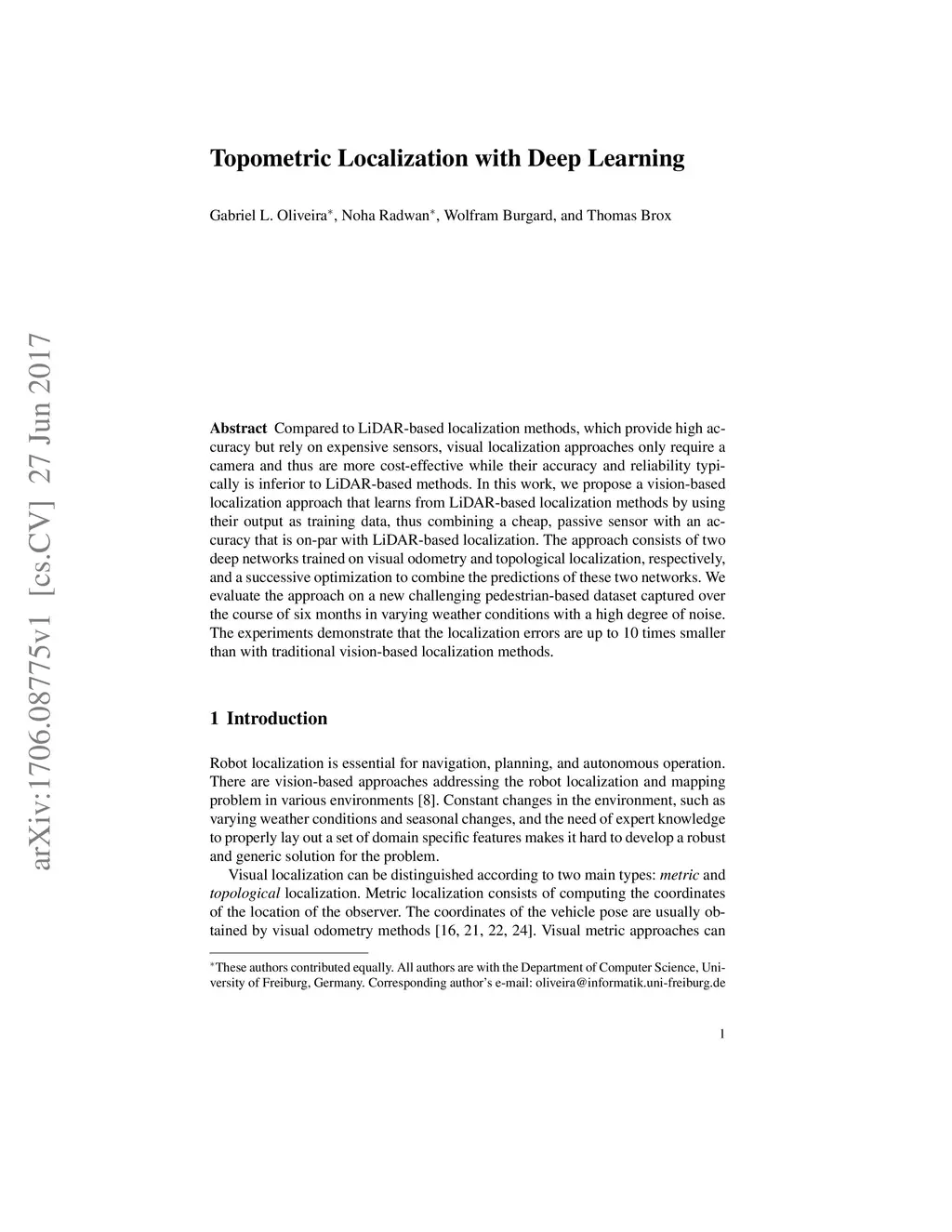 Compared to LiDAR-based localization methods, which provide high accuracy but rely on expensive sensors, visual localization approaches only require a camera and thus are more cost-effective while their accuracy and reliability typically is inferior to LiDAR-based methods. In this work, we propose a vision-based localization approach that learns from LiDAR-based localization methods by using their output as training data, thus combining a cheap, passive sensor with an accuracy that is on-par with LiDAR-based localization. The approach consists of two deep networks trained on visual odometry and topological localization, respectively, and a successive optimization to combine the predictions of these two networks. We evaluate the approach on a new challenging pedestrian-based dataset captured over the course of six months in varying weather conditions with a high degree of noise. The experiments demonstrate that the localization errors are up to 10 times smaller than with traditional vision-based localization methods.