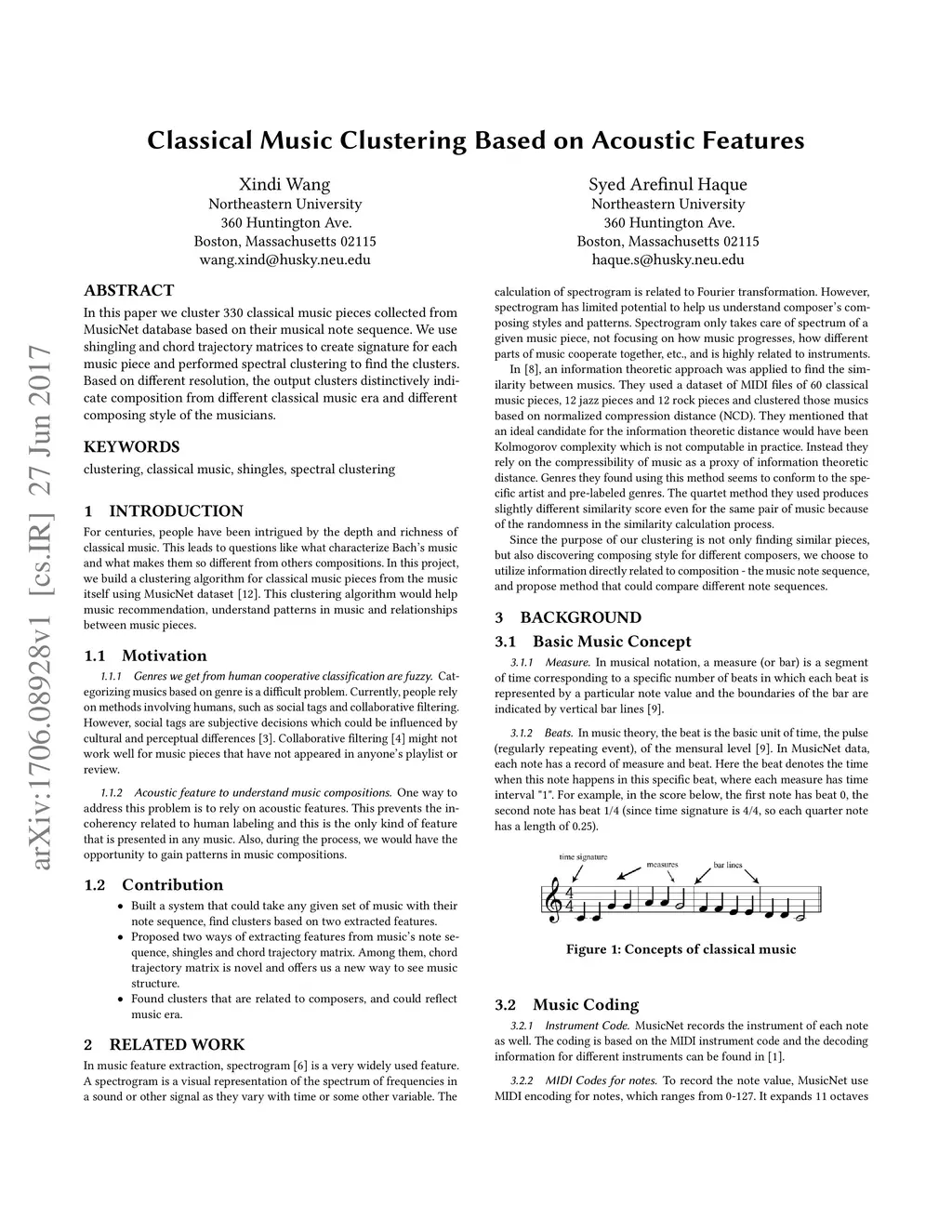 In this paper we cluster 330 classical music pieces collected from MusicNet database based on their musical note sequence. We use shingling and chord trajectory matrices to create signature for each music piece and performed spectral clustering to find the clusters. Based on different resolution, the output clusters distinctively indicate composition from different classical music era and different composing style of the musicians.