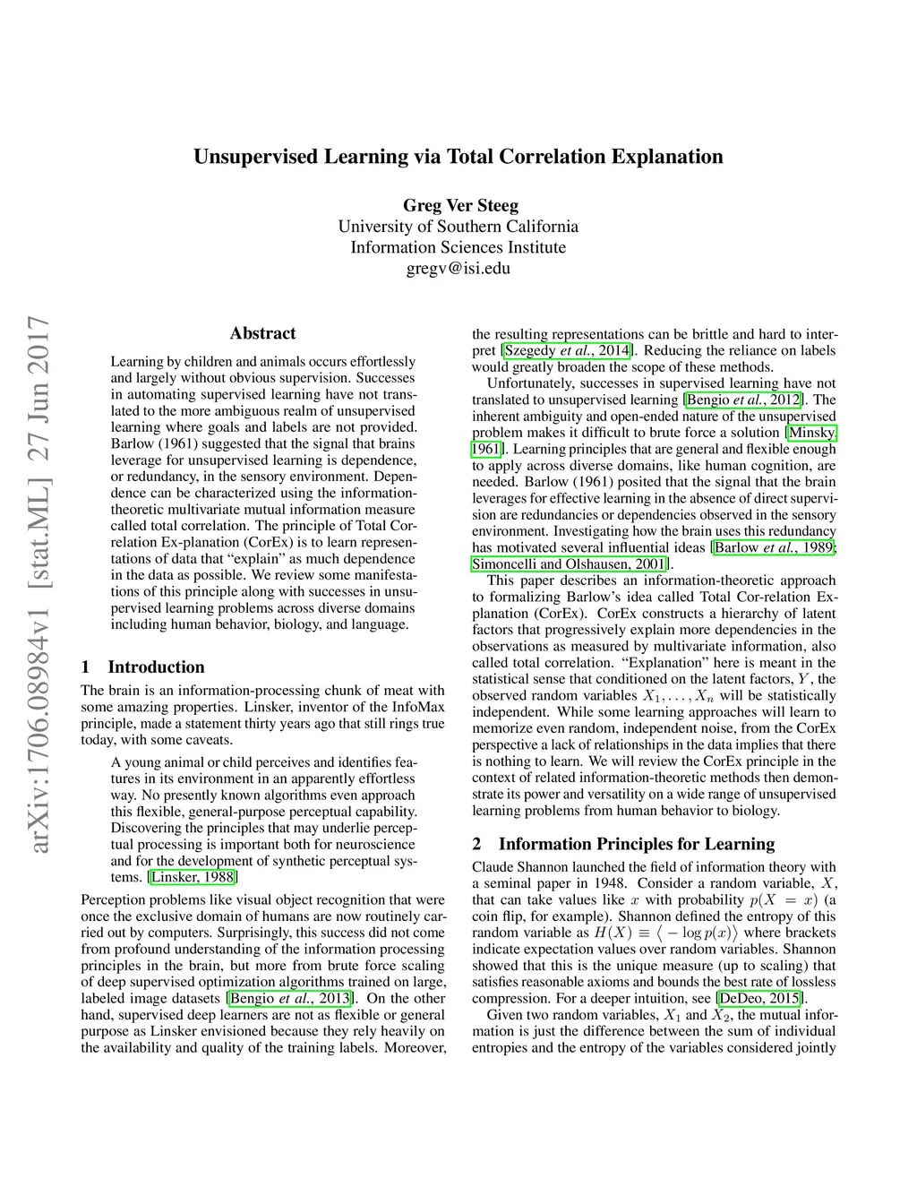 Learning by children and animals occurs effortlessly and largely without obvious supervision. Successes in automating supervised learning have not translated to the more ambiguous realm of unsupervised learning where goals and labels are not provided. Barlow (1961) suggested that the signal that brains leverage for unsupervised learning is dependence, or redundancy, in the sensory environment. Dependence can be characterized using the information-theoretic multivariate mutual information measure called total correlation. The principle of Total Cor-relation Ex-planation (CorEx) is to learn representations of data that "explain" as much dependence in the data as possible. We review some manifestations of this principle along with successes in unsupervised learning problems across diverse domains including human behavior, biology, and language.
