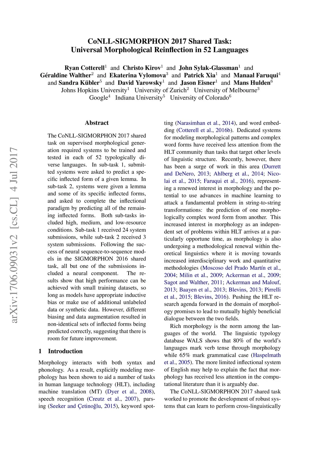 CoNLL-SIGMORPHON 2017 Shared Task: Universal Morphological Reinflection