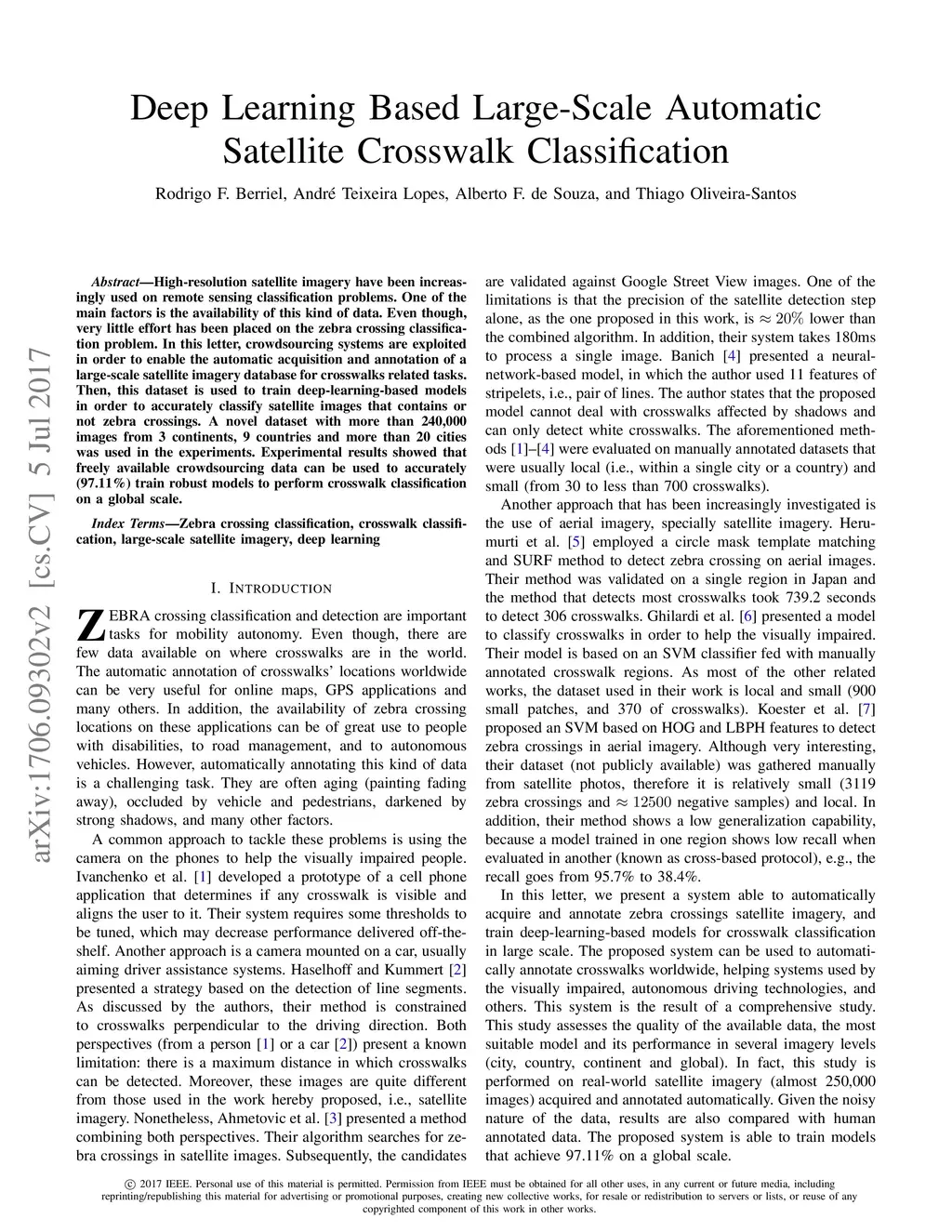 High-resolution satellite imagery have been increasingly used on remote sensing classification problems. One of the main factors is the availability of this kind of data. Even though, very little effort has been placed on the zebra crossing classification problem. In this letter, crowdsourcing systems are exploited in order to enable the automatic acquisition and annotation of a large-scale satellite imagery database for crosswalks related tasks. Then, this dataset is used to train deep-learning-based models in order to accurately classify satellite images that contains or not zebra crossings. A novel dataset with more than 240,000 images from 3 continents, 9 countries and more than 20 cities was used in the experiments. Experimental results showed that freely available crowdsourcing data can be used to accurately (97.11%) train robust models to perform crosswalk classification on a global scale.