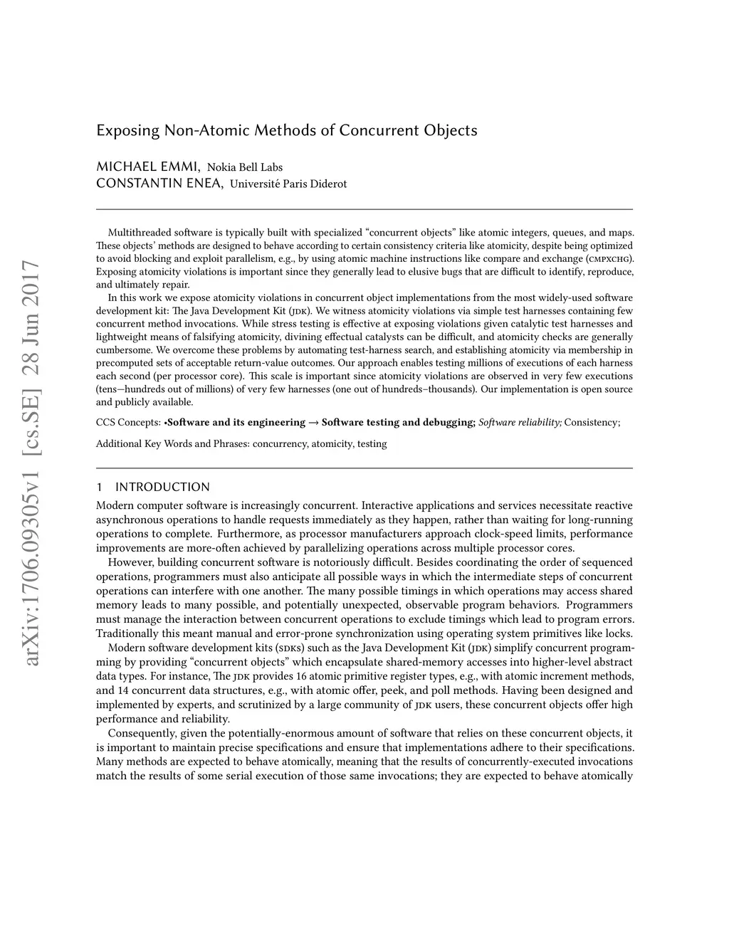 Multithreaded software is typically built with specialized concurrent objects like atomic integers, queues, and maps. These objects' methods are designed to behave according to certain consistency criteria like atomicity, despite being optimized to avoid blocking and exploit parallelism, e.g., by using atomic machine instructions like compare and exchange (cmpxchg). Exposing atomicity violations is important since they generally lead to elusive bugs that are difficult to identify, reproduce, and ultimately repair. In this work we expose atomicity violations in concurrent object implementations from the most widely-used software development kit: The Java Development Kit (JDK). We witness atomicity violations via simple test harnesses containing few concurrent method invocations. While stress testing is effective at exposing violations given catalytic test harnesses and lightweight means of falsifying atomicity, divining effectual catalysts can be difficult, and atomicity checks are generally cumbersome. We overcome these problems by automating test-harness search, and establishing atomicity via membership in precomputed sets of acceptable return-value outcomes. Our approach enables testing millions of executions of each harness each second (per processor core). This scale is important since atomicity violations are observed in very few executions (tens to hundreds out of millions) of very few harnesses (one out of hundreds to thousands). Our implementation is open source and publicly available.