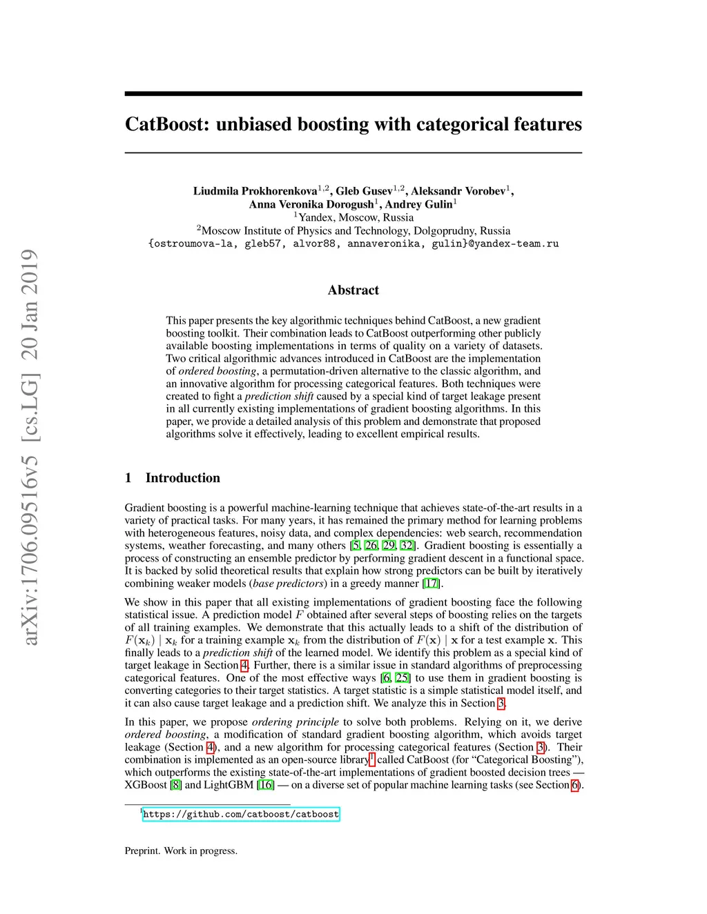This paper presents the key algorithmic techniques behind CatBoost, a new gradient boosting toolkit. Their combination leads to CatBoost outperforming other publicly available boosting implementations in terms of quality on a variety of datasets. Two critical algorithmic advances introduced in CatBoost are the implementation of ordered boosting, a permutation-driven alternative to the classic algorithm, and an innovative algorithm for processing categorical features. Both techniques were created to fight a prediction shift caused by a special kind of target leakage present in all currently existing implementations of gradient boosting algorithms. In this paper, we provide a detailed analysis of this problem and demonstrate that proposed algorithms solve it effectively, leading to excellent empirical results.