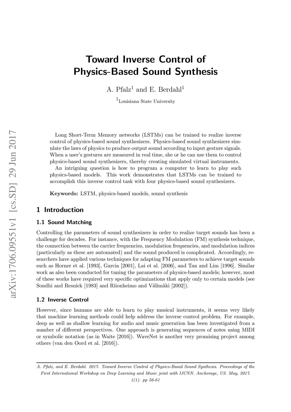 Long Short-Term Memory networks (LSTMs) can be trained to realize inverse control of physics-based sound synthesizers. Physics-based sound synthesizers simulate the laws of physics to produce output sound according to input gesture signals. When a user's gestures are measured in real time, she or he can use them to control physics-based sound synthesizers, thereby creating simulated virtual instruments. An intriguing question is how to program a computer to learn to play such physics-based models. This work demonstrates that LSTMs can be trained to accomplish this inverse control task with four physics-based sound synthesizers.