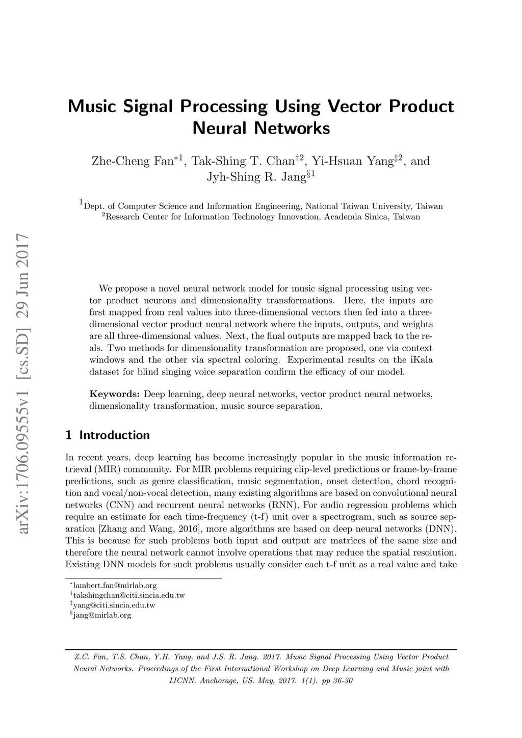 Music Signal Processing Using Vector Product Neural Networks