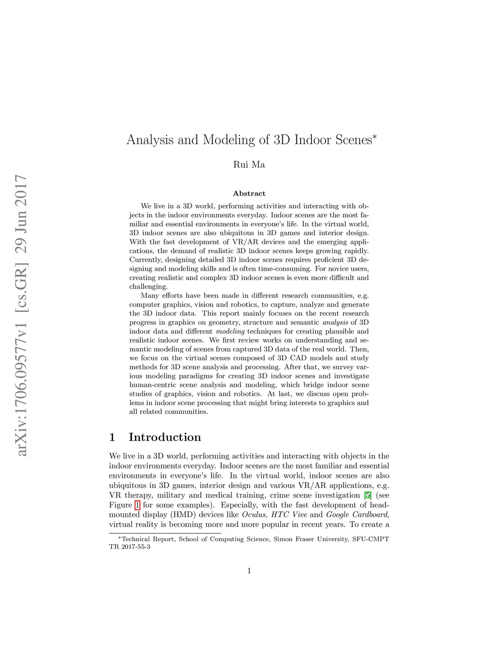 We live in a 3D world, performing activities and interacting with objects in the indoor environments everyday. Indoor scenes are the most familiar and essential environments in everyone's life. In the virtual world, 3D indoor scenes are also ubiquitous in 3D games and interior design. With the fast development of VR/AR devices and the emerging applications, the demand of realistic 3D indoor scenes keeps growing rapidly. Currently, designing detailed 3D indoor scenes requires proficient 3D designing and modeling skills and is often time-consuming. For novice users, creating realistic and complex 3D indoor scenes is even more difficult and challenging. Many efforts have been made in different research communities, e.g. computer graphics, vision and robotics, to capture, analyze and generate the 3D indoor data. This report mainly focuses on the recent research progress in graphics on geometry, structure and semantic analysis of 3D indoor data and different modeling techniques for creating plausible and realistic indoor scenes. We first review works on understanding and semantic modeling of scenes from captured 3D data of the real world. Then, we focus on the virtual scenes composed of 3D CAD models and study methods for 3D scene analysis and processing. After that, we survey various modeling paradigms for creating 3D indoor scenes and investigate human-centric scene analysis and modeling, which bridge indoor scene studies of graphics, vision and robotics. At last, we discuss open problems in indoor scene processing that might bring interests to graphics and all related communities.