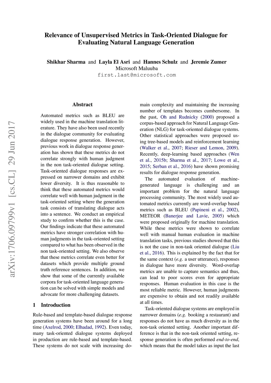 Relevance of Unsupervised Metrics in Task-Oriented Dialogue for