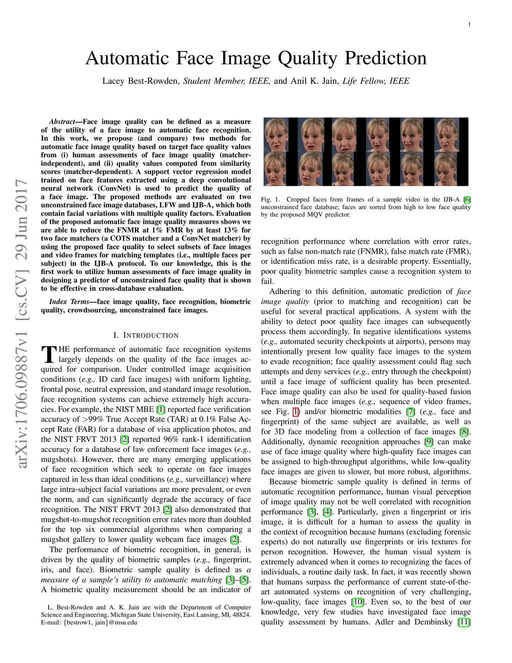 Face image quality can be defined as a measure of the utility of a face image to automatic face recognition. In this work, we propose (and compare) two methods for automatic face image quality based on target face quality values from (i) human assessments of face image quality (matcher-independent), and (ii) quality values computed from similarity scores (matcher-dependent). A support vector regression model trained on face features extracted using a deep convolutional neural network (ConvNet) is used to predict the quality of a face image. The proposed methods are evaluated on two unconstrained face image databases, LFW and IJB-A, which both contain facial variations with multiple quality factors. Evaluation of the proposed automatic face image quality measures shows we are able to reduce the FNMR at 1% FMR by at least 13% for two face matchers (a COTS matcher and a ConvNet matcher) by using the proposed face quality to select subsets of face images and video frames for matching templates (i.e., multiple faces per subject) in the IJB-A protocol. To our knowledge, this is the first work to utilize human assessments of face image quality in designing a predictor of unconstrained face quality that is shown to be effective in cross-database evaluation.