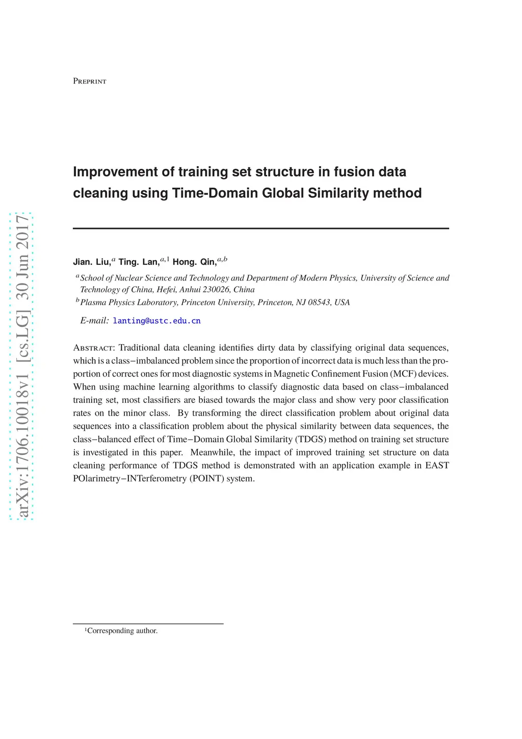 Traditional data cleaning identifies dirty data by classifying original data sequences, which is a classimbalanced problem since the proportion of incorrect data is much less than the proportion of correct ones for most diagnostic systems in Magnetic Confinement Fusion (MCF) devices. When using machine learning algorithms to classify diagnostic data based on classimbalanced training set, most classifiers are biased towards the major class and show very poor classification rates on the minor class. By transforming the direct classification problem about original data sequences into a classification problem about the physical similarity between data sequences, the classbalanced effect of TimeDomain Global Similarity (TDGS) method on training set structure is investigated in this paper. Meanwhile, the impact of improved training set structure on data cleaning performance of TDGS method is demonstrated with an application example in EAST POlarimetryINTerferometry (POINT) system.