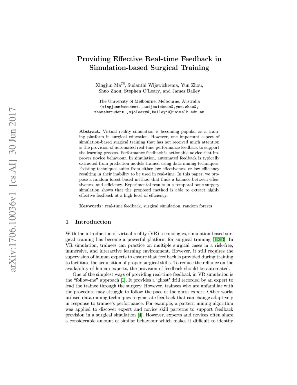 Virtual reality simulation is becoming popular as a training platform in surgical education. However, one important aspect of simulation-based surgical training that has not received much attention is the provision of automated real-time performance feedback to support the learning process. Performance feedback is actionable advice that improves novice behaviour. In simulation, automated feedback is typically extracted from prediction models trained using data mining techniques. Existing techniques suffer from either low effectiveness or low efficiency resulting in their inability to be used in real-time. In this paper, we propose a random forest based method that finds a balance between effectiveness and efficiency. Experimental results in a temporal bone surgery simulation show that the proposed method is able to extract highly effective feedback at a high level of efficiency.