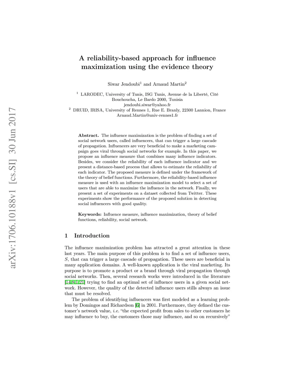 The influence maximization is the problem of finding a set of social network users, called influencers, that can trigger a large cascade of propagation. Influencers are very beneficial to make a marketing campaign goes viral through social networks for example. In this paper, we propose an influence measure that combines many influence indicators. Besides, we consider the reliability of each influence indicator and we present a distance-based process that allows to estimate the reliability of each indicator. The proposed measure is defined under the framework of the theory of belief functions. Furthermore, the reliability-based influence measure is used with an influence maximization model to select a set of users that are able to maximize the influence in the network. Finally, we present a set of experiments on a dataset collected from Twitter. These experiments show the performance of the proposed solution in detecting social influencers with good quality.
