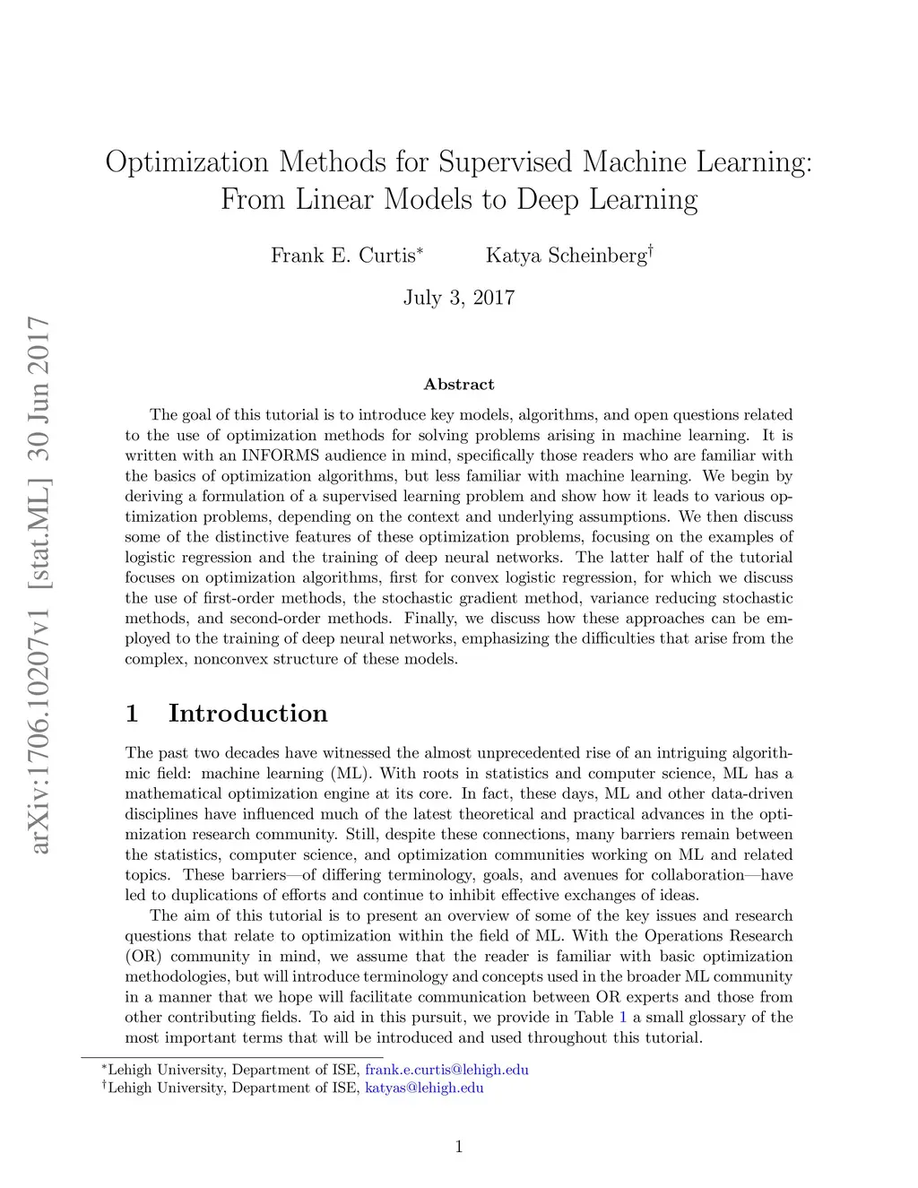 The goal of this tutorial is to introduce key models, algorithms, and open questions related to the use of optimization methods for solving problems arising in machine learning. It is written with an INFORMS audience in mind, specifically those readers who are familiar with the basics of optimization algorithms, but less familiar with machine learning. We begin by deriving a formulation of a supervised learning problem and show how it leads to various optimization problems, depending on the context and underlying assumptions. We then discuss some of the distinctive features of these optimization problems, focusing on the examples of logistic regression and the training of deep neural networks. The latter half of the tutorial focuses on optimization algorithms, first for convex logistic regression, for which we discuss the use of first-order methods, the stochastic gradient method, variance reducing stochastic methods, and second-order methods. Finally, we discuss how these approaches can be employed to the training of deep neural networks, emphasizing the difficulties that arise from the complex, nonconvex structure of these models.
