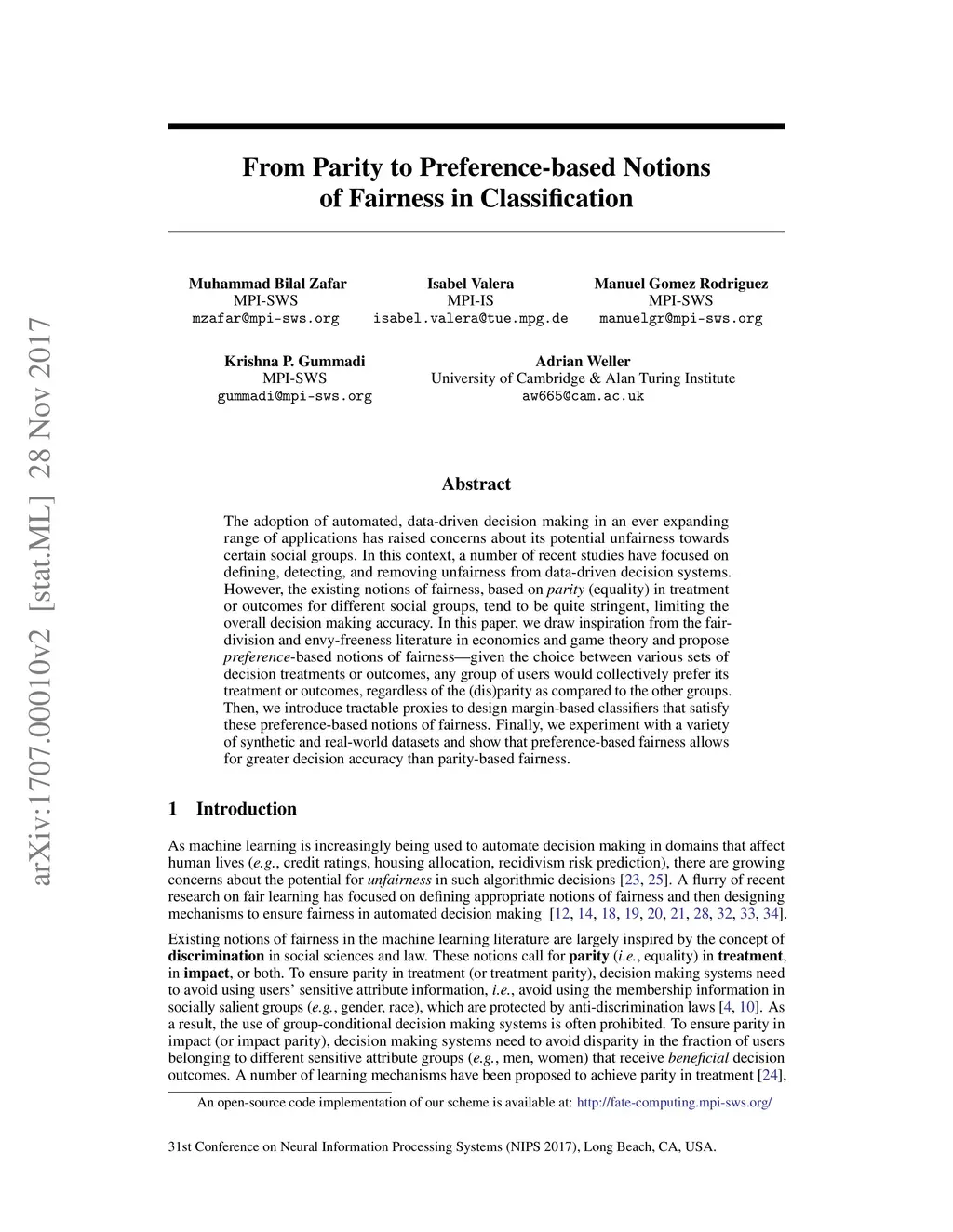 The adoption of automated, data-driven decision making in an ever expanding range of applications has raised concerns about its potential unfairness towards certain social groups. In this context, a number of recent studies have focused on defining, detecting, and removing unfairness from data-driven decision systems. However, the existing notions of fairness, based on parity (equality) in treatment or outcomes for different social groups, tend to be quite stringent, limiting the overall decision making accuracy. In this paper, we draw inspiration from the fair-division and envy-freeness literature in economics and game theory and propose preference-based notions of fairness -- given the choice between various sets of decision treatments or outcomes, any group of users would collectively prefer its treatment or outcomes, regardless of the (dis)parity as compared to the other groups. Then, we introduce tractable proxies to design margin-based classifiers that satisfy these preference-based notions of fairness. Finally, we experiment with a variety of synthetic and real-world datasets and show that preference-based fairness allows for greater decision accuracy than parity-based fairness.