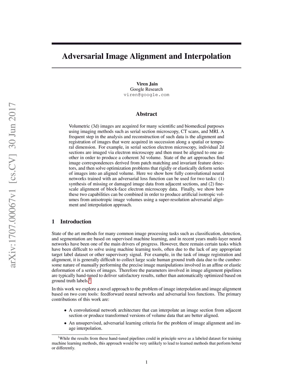 Volumetric (3d) images are acquired for many scientific and biomedical purposes using imaging methods such as serial section microscopy, CT scans, and MRI. A frequent step in the analysis and reconstruction of such data is the alignment and registration of images that were acquired in succession along a spatial or temporal dimension. For example, in serial section electron microscopy, individual 2d sections are imaged via electron microscopy and then must be aligned to one another in order to produce a coherent 3d volume. State of the art approaches find image correspondences derived from patch matching and invariant feature detectors, and then solve optimization problems that rigidly or elastically deform series of images into an aligned volume. Here we show how fully convolutional neural networks trained with an adversarial loss function can be used for two tasks: (1) synthesis of missing or damaged image data from adjacent sections, and (2) fine-scale alignment of block-face electron microscopy data. Finally, we show how these two capabilities can be combined in order to produce artificial isotropic volumes from anisotropic image volumes using a super-resolution adversarial alignment and interpolation approach.