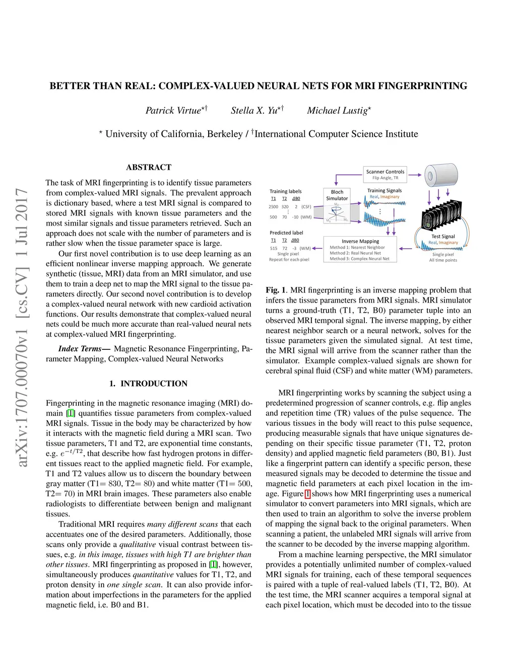 The task of MRI fingerprinting is to identify tissue parameters from complex-valued MRI signals. The prevalent approach is dictionary based, where a test MRI signal is compared to stored MRI signals with known tissue parameters and the most similar signals and tissue parameters retrieved. Such an approach does not scale with the number of parameters and is rather slow when the tissue parameter space is large. Our first novel contribution is to use deep learning as an efficient nonlinear inverse mapping approach. We generate synthetic (tissue, MRI) data from an MRI simulator, and use them to train a deep net to map the MRI signal to the tissue parameters directly. Our second novel contribution is to develop a complex-valued neural network with new cardioid activation functions. Our results demonstrate that complex-valued neural nets could be much more accurate than real-valued neural nets at complex-valued MRI fingerprinting.