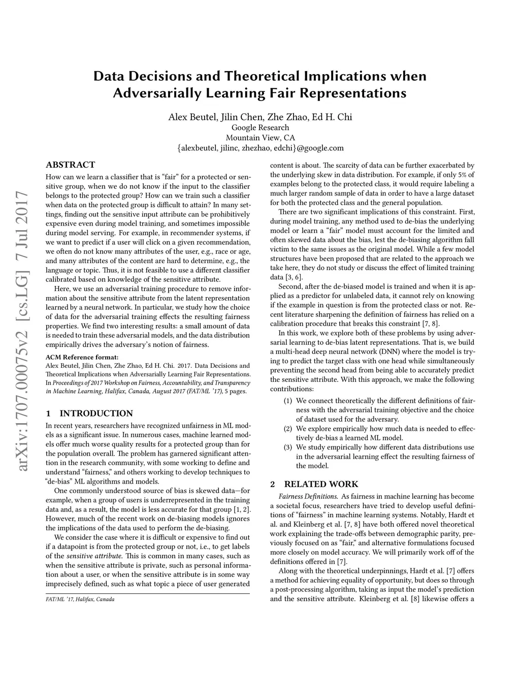 How can we learn a classifier that is "fair" for a protected or sensitive group, when we do not know if the input to the classifier belongs to the protected group? How can we train such a classifier when data on the protected group is difficult to attain? In many settings, finding out the sensitive input attribute can be prohibitively expensive even during model training, and sometimes impossible during model serving. For example, in recommender systems, if we want to predict if a user will click on a given recommendation, we often do not know many attributes of the user, e.g., race or age, and many attributes of the content are hard to determine, e.g., the language or topic. Thus, it is not feasible to use a different classifier calibrated based on knowledge of the sensitive attribute. Here, we use an adversarial training procedure to remove information about the sensitive attribute from the latent representation learned by a neural network. In particular, we study how the choice of data for the adversarial training effects the resulting fairness properties. We find two interesting results: a small amount of data is needed to train these adversarial models, and the data distribution empirically drives the adversary's notion of fairness.