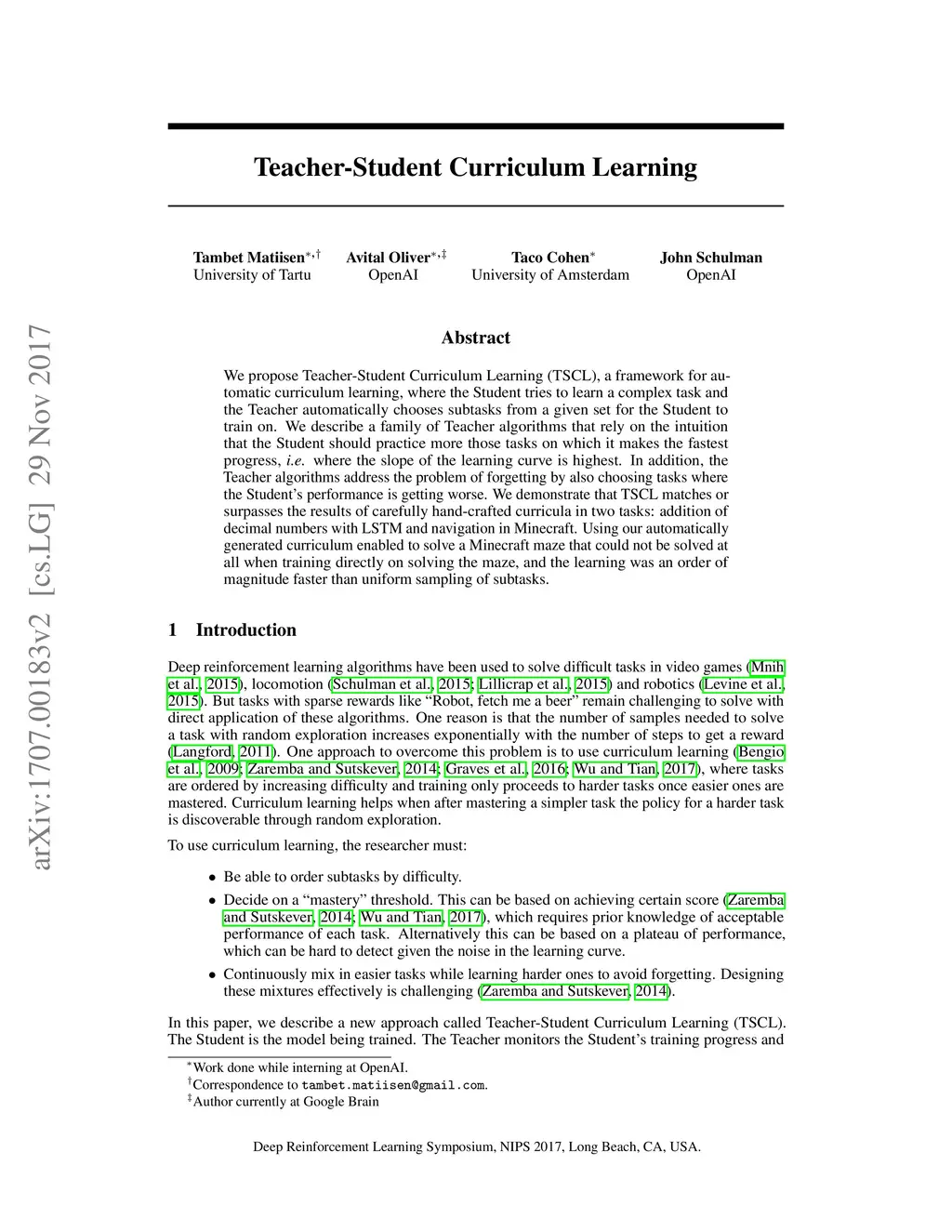 Teacher-Student Curriculum Learning