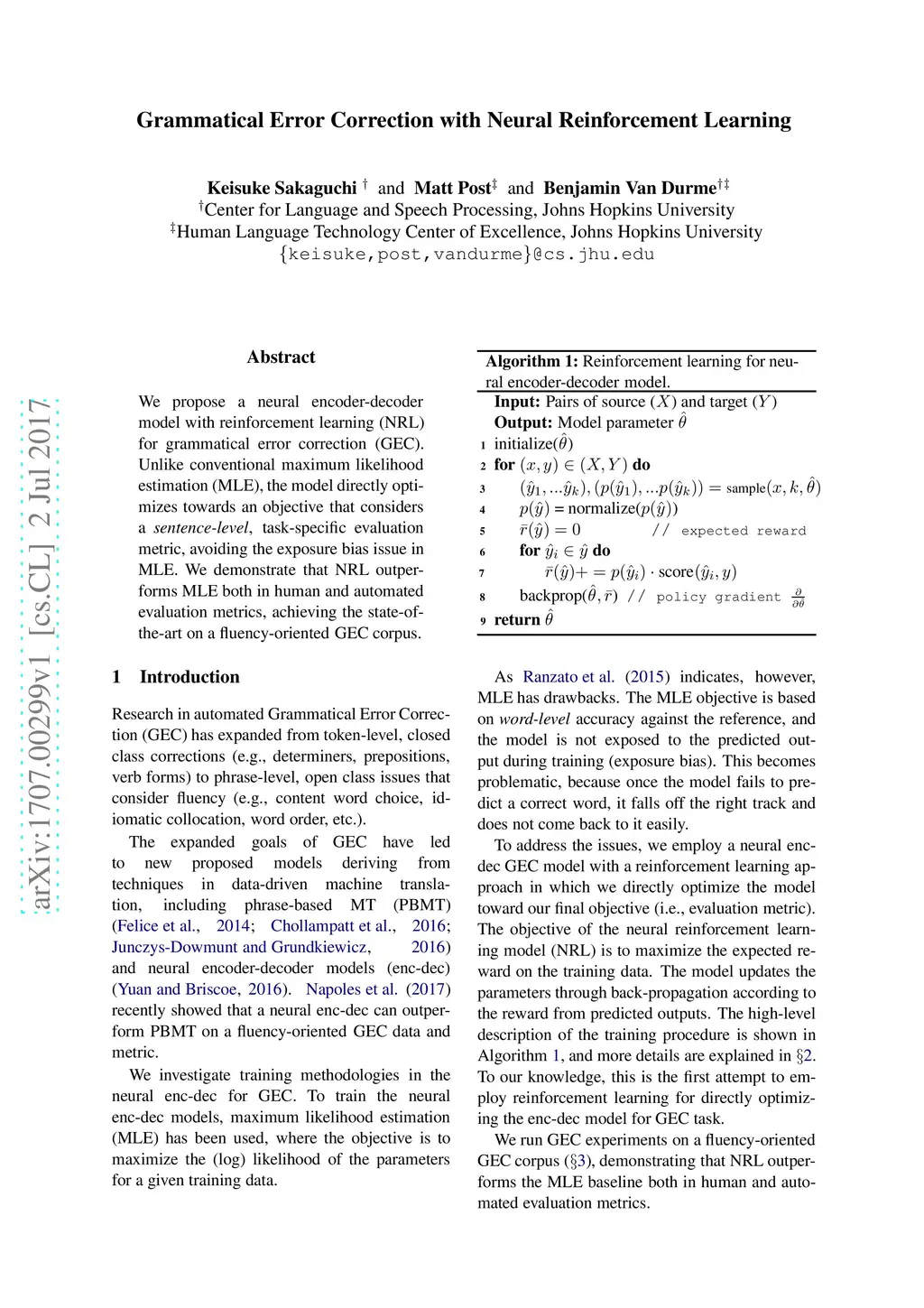 Grammatical Error Correction with Neural Reinforcement Learning